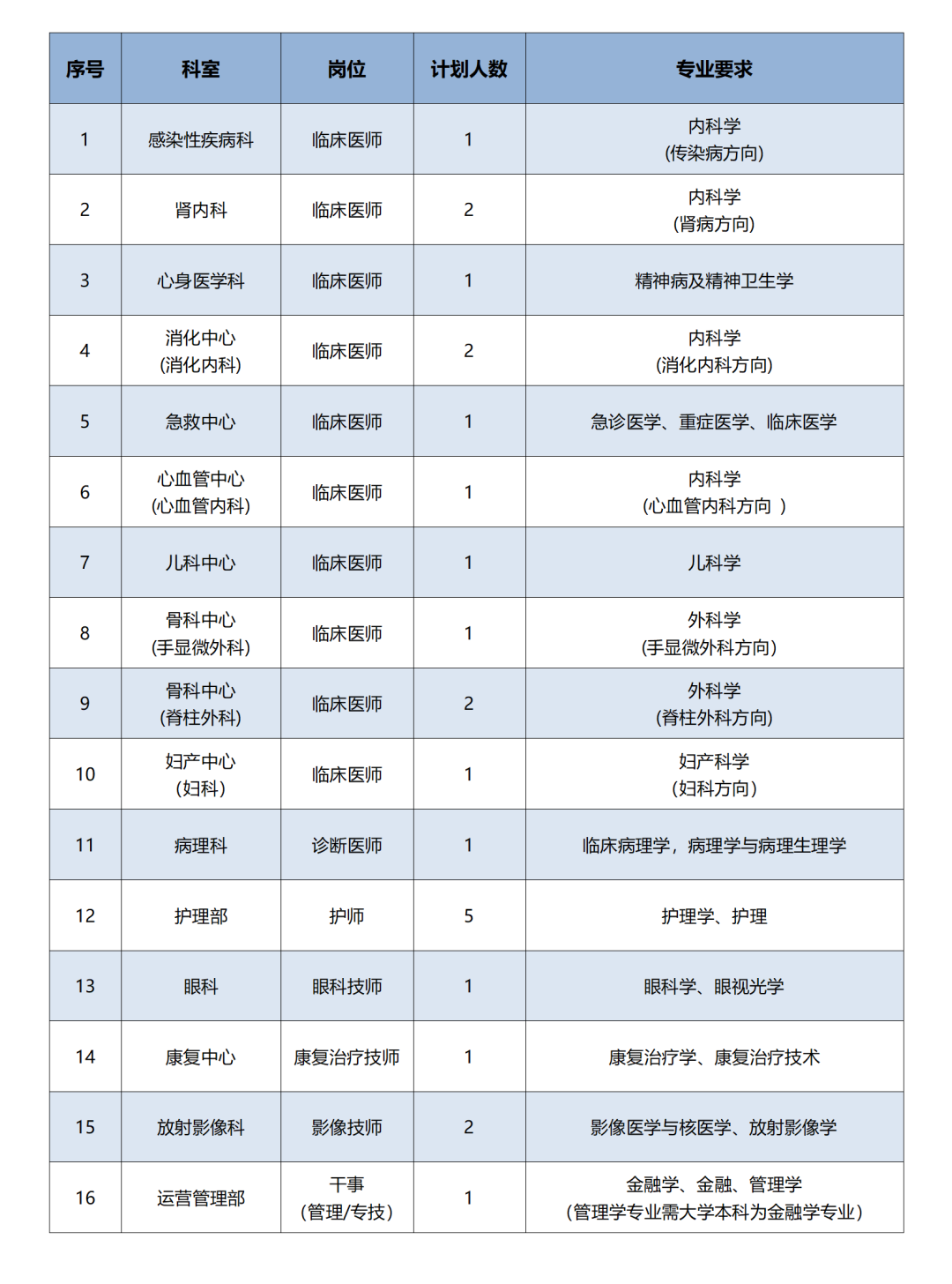 遂宁市中心医院是一所集医疗、教学、科研、预防、保健为一体的国家三级甲等综合医院。先后被评为全国文明单位、全国精神文明建设工作先进单位、全国人文爱心医院、全国优秀爱婴医院、省级最佳文明单位,并荣获四川省抗击新冠肺炎疫情先进集体、四川省脱贫攻坚先进集体、四川省医疗卫生系统先进集体、四川省五一劳动奖状。承担着省内外十余家医学院校的临床教学任务,是重庆医科大学、川北医学院附属医院、成都中医药大学遂宁临床学院及遵义医科大学的研究生联合培养单位,国家第一批住院医师规范化培训基地、四川省专科医师规范化培训基地、四川省全科医生转岗培训基地。是西班牙特拉萨大学医院、法国昂热医教中心、加拿大七橡树综合医院国际友好合作医院。建立了遂宁市首个院士工作站,与毕晓普癌症研究所合作共建了精准肿瘤基础实验室,与中国科学院大学共建了健康医疗大数据遂宁研究中心,建设了高标准的生物样本库和基因测序实验室。连续四年国家三级公立医院绩效考核获得四次A一次A+。四川省卫生行政主管部门最新发布的《四川省医疗服务与质量报告》对16个临床专科进行了排名,医院有10个专科进入前十名,8个专科进入了前五名。 依据医院发展规划和学科建设需要,现面向全国引进高层次人才,有关事项公告如下:1.招聘对象:2024届普通高校应届毕业生及符合岗位条件的社会在职、非在职人员。1.招聘对象:2024届普通高校应届毕业生及符合岗位条件的社会在职、非在职人员。 2. 一次性发放安家补助及生活补助,一事一议(具体面谈),20万~100万。5. 结合本人意愿,按照相关政策协助解决配偶工作以及子女入学等事宜。6. 入职后根据科研成果,按照医院有关管理办法,发放科技奖励绩效。1. 按照相关政策可参加遂宁市人力资源和社会保障局组织的公开考核招聘解决事业编制。2. 到岗考核合格后发放安家补助及生活补助5万元。3. 入职后根据科研成果,按照医院有关管理办法,发放科技奖励绩效。经住培合格的大学本科学历的临床医师,按川卫科教函【2022】91号落实住院医师规范化培训“两个同等对待”相关政策。1. 报名时间:即日起报名至2024年3月12日为止。① 下载填写《遂宁市中心医院应聘人员基本信息登记表》(见附件)报名人员通过微信扫描右侧二维码或点击链接https://www.wjx.cn/vm/t6I88cd.aspx填写个人信息并提交;成功提交后将报名所需材料电子版发至邮箱sns120hr@163.com,材料标题格式“科室-岗位-学历-姓名”,如“急救中心-临床医师-硕士研究生-张三”。 报名人员通过初选后须根据本单位的通知与安排,在约定时间内至意向科室完成为期不少于5天的岗位技能考核及面试 。依据考核,按照竞争择优、双向选择的原则确定录用人员,并与医院签订意向性引进协议或《全国普通高等学校毕业生就业协议书》。体检标准将参照修订后的《公务员录用体检通用标准(试行)》及《公务员录用体检操作手册(试行)》有关规定执行。具体时间另行通知,一般为到岗报到前1个月之内。未在规定时间内(时间另行通知)来院办理入职的,视为自动放弃。联系电话:0825-2292610(人力资源部吉老师)。联系地址:四川省遂宁市河东院区东平北路27号,遂宁市中心医院河东院区科教大楼人力资源部502办公室。