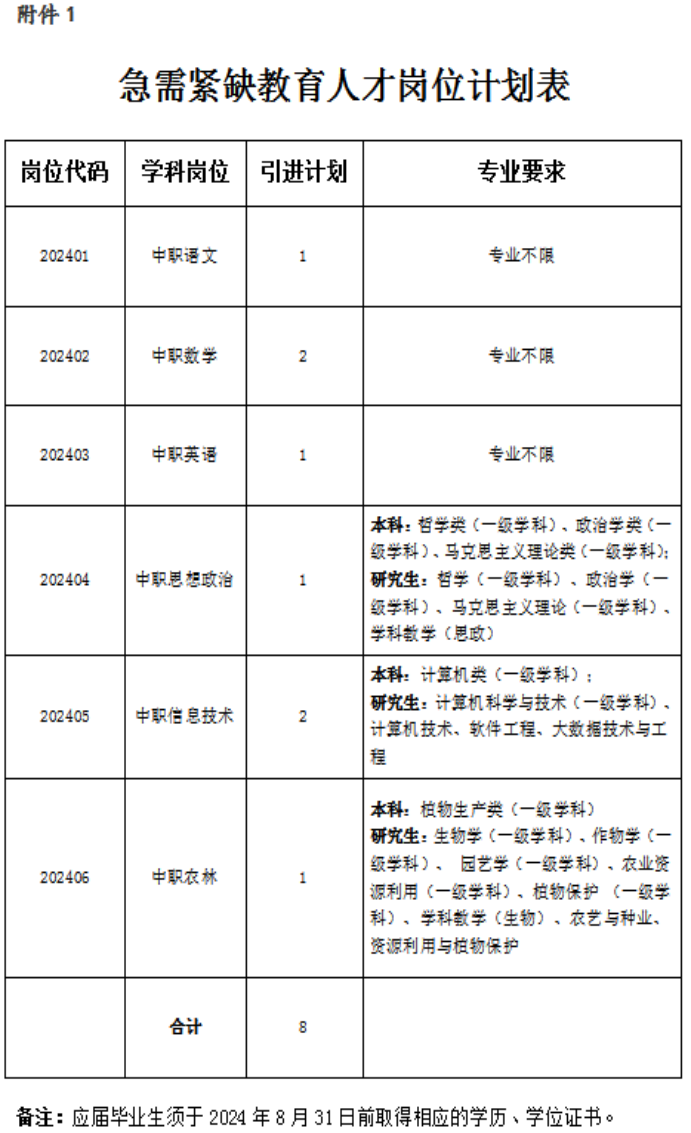 为深入实施人才强市战略, 经广德市委人才工作领导小组研究,按照公开、公平、竞争、择优原则,拟面向社会引进8名急需紧缺教育人才。现将有关事项公告如下: 一、引进计划 本次共设6个岗位引进8名急需紧缺教育人才,具体岗位见附件1。