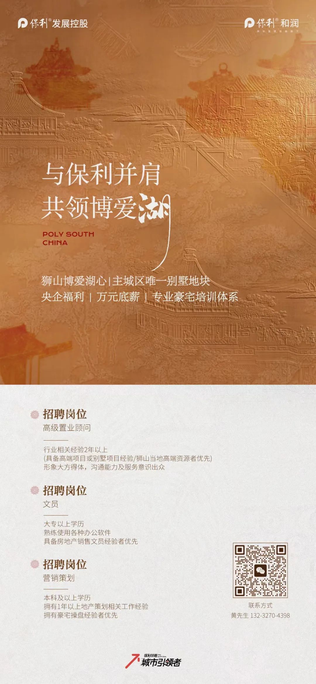 与保利并肩,共领博爱湖! 狮山博爱湖心·唯一别墅地块 保利博爱湖项目招人了 保利博爱湖项目毗邻狮山博爱湖芯,项目三面环湖,地段优越,最大容积率仅1.1,将打造狮山主城区稀缺的别墅产品。项目周边被成熟小区包围,隔湖与越秀御湖台对望。直线距离佛山4号线博爱湖站(在建)仅约数百米,周边有狮山体育馆、奥园广场、石门高级中学等配套环绕。 保利博爱湖项目现发布“精英召集令”,央企大平台,享万元底薪,提供专业的豪宅培训体系。目前诚招高级置业顾问、文员、营销策划岗位:(具备高端项目或别墅项目经验/狮山当地高端资源者优先)大专以上学历 熟练使用各种办公软件 具备房地产销售文员经验者优先 本科及以上学历 拥有1年以上地产策划相关工作经验 拥有豪宅操盘经验者优先