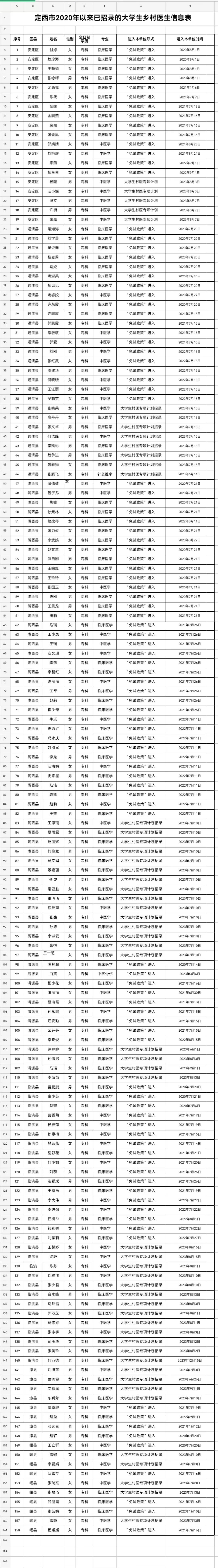 根据省卫生健康委、省委编办等5部门《关于做好大学生乡村医生已招录人员专项招聘工作的通知》《甘肃省实施大学生乡村医生专项计划工作方案的通知》精神,为严密、公正、高效做好大学生乡村医生已招录人员专项招聘工作,现就有关事宜公告如下:通过各级资格审核,目前仍在定西市乡镇卫生院(不含社区卫生服务中心)一体化管理的村卫生室(不含社区卫生服务站)服务的158名大学生乡村医生(人员名单详见附件)。由市卫生健康、机构编制、教育、财政、人社等部门联合成立面试考核组,组织资格审核通过人员面试。面试划定最低控制分数线60分,全程录像,成绩现场公布,考生签字确认。达不到面试最低控制分数线的不得进入下一环节。面试时间及地点:2024年3月16日,安定区大城小学新城分校(具体事宜另行通知)。体检由市卫生健康委统一组织,参照《关于修订〈公务员录用体检标准(试行)〉及〈公务员录用体检操作手册(试行)〉的通知》执行,费用由考生自行承担,考生对体检结果有疑问时,可以在接到体检结论通知之日起2日内,提出复检申请,复检以一次为限,以复检结论为准。对弄虚作假或者隐瞒真实情况(如隐瞒影响聘用的疾病、病史)致使体检结果失真等严重违纪违规行为的,不予聘用。体检时须携带身份证原件、面试通知书。未按规定时间到指定地点参加体检或体检不合格的,不再进入招聘后续环节。体检时间另行通知。体检结束后,招聘工作专班组成两人以上的考察小组,采取个别谈话、召开座谈会、听取群众意见等方法, 对考察对象的德、能、勤、绩、学、廉以及医德医风、服务能力、日常管理、群众满意度等方面进行全面考察,考察结束后形成“通过”或“不通过”结论。通过面试、体检、考察的人员确定为拟聘人员,拟聘人员名单通过市、县级相关部门网站、所在乡镇卫生院和村委会进行公示,公示时间为5个工作日。对公示期间反映的问题,由招聘工作专班负责调查核实,经查证属实,不符合聘用规定的,取消聘用资格;一时难以查实的,可暂缓聘用,待查清后再决定是否聘用。按程序报批或备案后,乡镇卫生院与受聘人员签订事业单位聘用合同,确立人事关系。大学生乡村医生专项计划编制实行专编专用、专门管理,入编后应当在村卫生室继续服务不低于6年(不含参加规范化培训时间),3年内未取得执业(助理)医师资格的应当解除聘用合同。考生凭本人身份证领取面试通知书,并需提供个人2寸蓝底近期免冠照二张。其他未尽事宜请联系0932-8333694。附:定西市2020年以来已招录的大学生乡村医生信息表