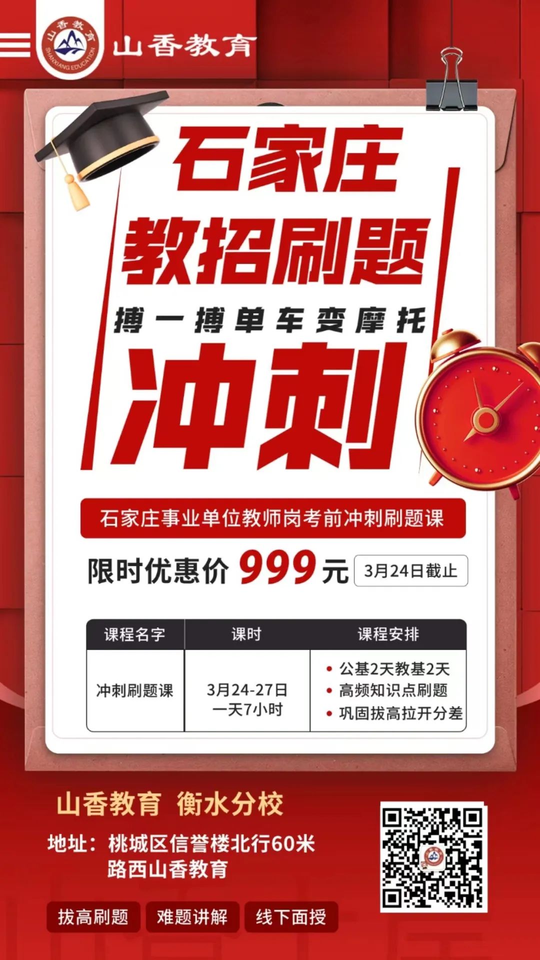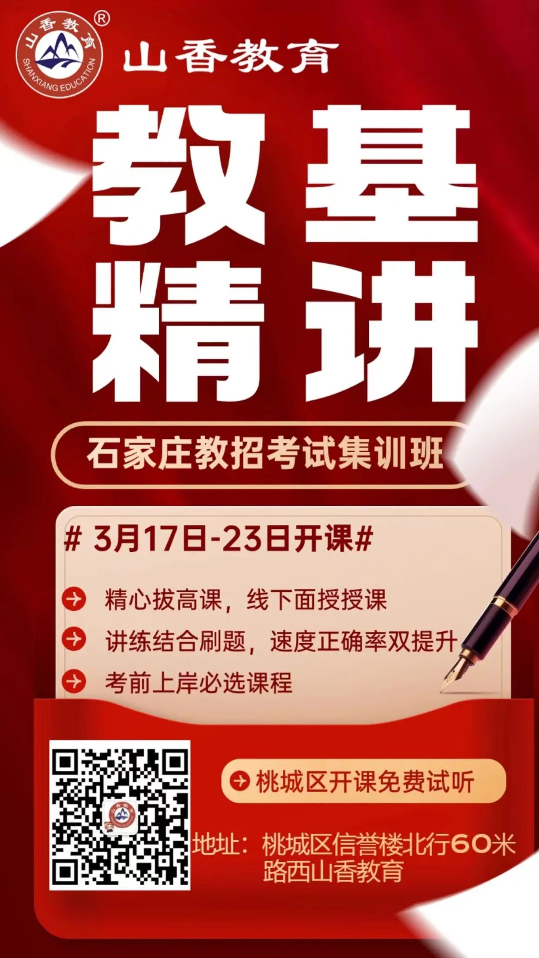 四、工作地点 工作地址:河北省石家市湘江道3号 五、招聘程序 (一)发布公告 2024年3月6日通过诺优考www.nuoyoukao.com向社会公开发布招聘信息。 (二)报名及资格审查 1.报名方式及时间 采用网上报名和资格初审的方式, 报名网址:https://s.nuoyoukao.com/s/2462 2.网上报名时间:2024年3月6日11:00—2024年9月30日17:00 3.报名注意事项 资格审查标准:依据招聘岗位设置的条件进行资格审查。网上资格初审通过的考生具备参加面试资格。查询结果为“初审驳回”的考生可根据提示驳回原因进行修改,审核工作人员根据修改后信息进行再次审核。经修改后,初审结果仍显示“未通过”且不能再修改的考生不具备报名资格。 网上审核时间:2024年3月6日11:00—2024年4月30日17:00 特别说明: (1)网上报名实行严格的自律机制,考生必须对提交审核的报名信息的真实性负责。在资格审核时,凡发现网上填报的信息与实际情况不一致的,取消应聘资格。 (2)报名时请规范填写和选择表项,上传的电子照片要符合要求,否则将被报名系统自动拒绝。 (3)考生应及时关注报名网站的面试等后续通知;务必牢记报名截止时间、面试时间等重要时间信息,凡是在规定时间未完成相关操作的,将被视为自动放弃。 (4)考生参加面试时采取线下面试的形式。 (三)面试 面试时间:面试具体时间招聘经理会以电话形式通知,请各位考生注意接听电话。 特别提醒:1.请考生网上报名时,务必填写本人常用联系方式,确保在招录期间保持手机等通讯设备畅通。 2.本公告发布后,如遇疫情防控态势突发重大变化,将按照上级指示精神,酌情调整变更相关工作安排。 应聘报名问题咨询电话:17743694325 焦老师 (咨询电话工作时间:周一至周五上午9:00-11:00,下午14:00-17:00) 河北诺聘网络科技有限公司 *如果你对当地考情有任何疑问,或者备考过程中遇到了问题,都可以扫描下方二维码,会有专业的老师为你答疑解惑喔~ 更多备考福利 长按识别二维码. ➭后台回复免费领取,获取教资资料 ➭后台回复礼包,获取2024备考大礼包 ![]() 设置星标 及时接收教资及招考信息 课程详情请咨询: ![]() ![]() 衡水各分校联系方式 衡水分校 15503237955 15531870019 13393087191 15503238911 15031831532 18832807311 景县分校 15369877051 15503238911 饶阳分校 13383187531 18732866688 安平分校 18232921012 15031833602 安平县二院北行50米路东山香教育 深州分校 15031833602 18232921012 冀州分校 15531870019 13393087191 枣强分校 15731876899 15369877051 故城分校 13315833722 17331871119 阜 城 分 校 15369877051 15503238911 武 强 分 校 19131381617 18003283339 山香教育 |