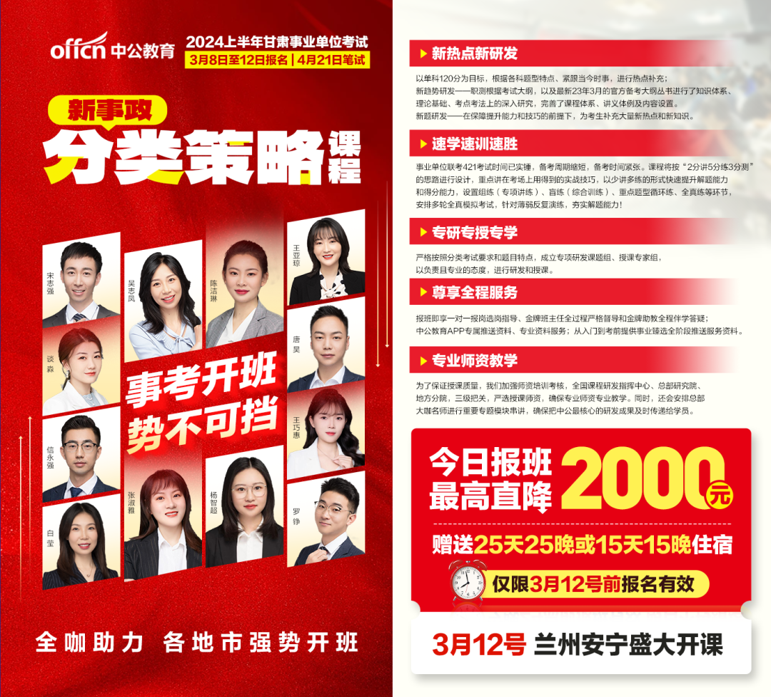 | 2 | 发送 图书 购买公职类考试备考教材 | 3 | 发送 时政 免费领取23时政及试题 | 时间:2024年3月12日(星期二)10:00-14:00地点:甘肃人才网(https://www.gszhaopin.com)观看直播平台:甘肃省人力资源市场官方抖音号(1058745969)、甘肃省人力资源市场视频号承办单位:兰州新区西岔园区民政和社会保障局 兰州新区秦东蓝海人力资源服务有限公司 甘肃省人力资源市场协办单位:西岔镇人民政府 兰州新区人才服务中心有限公司(一)参会企业。以民营企业、中小微企业为重点,同时面向兰州新区各类有用工需求的社会组织、个体工商户等用工主体。(二)招聘对象。应往届高校毕业生、退役军人、脱贫劳动力、登记失业人员、农民工、移民安置人员为重点,同时面向各类求职人员。求职者准备个人简历及证书资料,于3月12日(星期二)10:00-14:00到达招聘会现场,并根据指引有序进入会场参会。求职者通过PC端或手机端登录甘肃人才网(https://www.gszhaopin.com),进入展会大厅,选择意向岗位,点击“求职者登录”,登录个人账号,完善个人简历后,根据指引投递简历,参会求职。4.21联考新事政分类策略班 新热点新研发 专研专授专学 需要历年试题的同学扫码领取 3.12前报班赠住宿|享大额优惠 3.12兰州确定开课|详情私聊