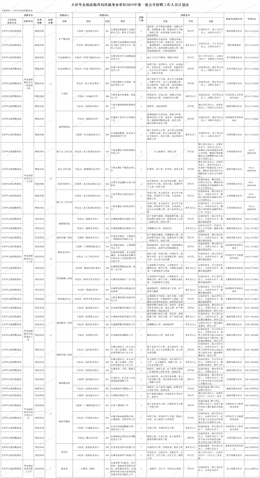 ![]() 天津华北地质勘查局所属事业单位2024年第一批公开招聘73名工作人员实施方案(河北56人)根据《关于印发<天津市事业单位公开招聘人员实施办法(试行)>的通知》(津人社局发〔2011〕10号)、《关于进一步完善事业单位公开招聘工作的通知》(津人社局发〔2017〕37号)等规定,天津华北地质勘查局所属事业单位2024年面向社会公开招聘事业编制工作人员73名,具体方案公告如下。点击查看更多招聘信息 一、招聘单位基本情况 (一)招聘单位名称 1.华北地质勘查局五一四地质大队 2.华北地质勘查局五一七大队 3.华北地质勘查局五一九大队 4.华北地质勘查局第四地质大队 5.华北地质勘查局综合普查大队 6.天津华北地质勘查局核工业二四七大队 7.华北地质勘查局职工大学 8.天津华北地质勘查总院 9.天津市地质研究和海洋地质中心 10.天津市地球物理勘探中心 (二)招聘单位性质 财政补助事业单位。 二、招聘对象及招聘条件 (一)招聘对象 符合岗位要求及报考条件的应届毕业生及社会人员。 应届毕业生是指2024届高校毕业生(2022、2023年毕业后未就业高校毕业生视同为应届毕业生)。 按照《市人社局关于贯彻落实〈人力资源社会保障部关于职业院校毕业生参加事业单位公开招聘有关问题的通知〉有关事项的通知》(津人社办发〔2021〕83号)文件要求,技工院校预备技师(技师)班毕业生与大学本科学历人员同等对待。 点击上方名片关注,查看河北事业单位招聘信息 (二)报考条件 1.报考人员应当具备以下条件: (1)具有中华人民共和国国籍; (2)拥护中华人民共和国宪法,遵守宪法和法律,具有良好的品行; (3)具有岗位所需要的专业,报考人员所学专业以本人毕业证书标注的专业为准;对于报考人员在校期间取得国家教育部门承认且能在相关认证网站核验的双学位证书或辅修专业证书(证书上必须注明专业)的,可依据双学位证书或辅修专业证书注明的专业报考;港、澳、台及国外院校专业以教育部留学服务中心出具的学历认证材料为准;专业参考教育部发《普通高等学校本科专业目录(2012年)》《普通高等学校本科专业目录(2020年)》《授予博士、硕士学位的培养研究生的学科、专业目录(1997年颁布,2008年更新)》《学位授予和人才培养学科目录(2011年)》《学位授予和人才培养学科目录(2018年)》等;点击查看更多招聘信息 (4)适应岗位所需要的身体条件; (5)符合回避的有关规定; (6)具备招聘岗位所规定的其他条件。 2.凡有下列情形之一者,不得报考: (1)受过刑事处罚和曾被开除公职的人员; (2)受过党内警告或行政记过及以上处分的人员; (3)正在接受立案审查或有犯罪嫌疑尚未查清的人员; (4)在公务员招考和事业单位公开招聘中被认定有违纪违规行为,在禁考期限的; (5)列入失信联合惩戒对象名单被依法限制招聘为事业单位工作人员的; (6)全日制在读的非应届毕业生; (7)现役军人; (8)有法律法规规定不得参加事业单位公开招聘的其他情形的。 三、招聘人数 本次拟招聘事业编制工作人员共计73名。 四、招聘信息 招聘单位、岗位名称、招聘条件、联系方式等信息详见《天津华北地质勘查局所属事业单位2024年第一批公开招聘计划表》(附件1) 五、公告发布 2024年3月11日—3月21日,在天津华北地质勘查局网站公布招聘方案(网址:http://www.ncge.cn/)。同时,各单位分别在网站公布招聘方案,华北地质勘查局五一四地质大队(网址:http://www.cdhk514.com/)、华北地质勘查局五一七大队(网址:http://www.nceii.com/)、华北地质勘查局五一九大队(网址:http://www.bd519.com/)、华北地质勘查局第四地质大队(网址:http://www.hkjsd.com/)、华北地质勘查局综合普查大队(网址:http://www.hkpcdd.com/)、天津华北地质勘查局核工业二四七大队(网址:http://www.tjhgy247.com/)、华北地质勘查局职工大学(网址:http://www.huakan721.com/)、天津华北地质勘查总院(网址:http://www.tjdkzy.com/)、天津市地质研究和海洋地质中心(网址:http://www.tjdyhyzx.com/)、天津市地球物理勘探中心(网址:http://www.tjwtzx.com/),公告期间接收报名材料。点击查看更多招聘信息 六、报名与资格审查 (一)报名 1、报名时间 2024年3月11日—3月22日,以电子邮箱记载时间为准。 2、报名方式 采取网上报名方式。报考人员将报名材料扫描依次插入word文档,连同近期1寸免冠彩色电子照片一并发送到报考单位指定电子邮箱。邮件主题及word文档名称必须按“姓名+性别+年龄+所学专业+报考岗位+岗位代码”格式及顺序填写,因填写内容不规范、不准确造成的相关后果,由报考人员承担。 3、报名材料 (1)应届毕业生提交材料:报名表(粘贴照片并本人签字)、身份证复印件、就业协议书或就业推荐表、招聘岗位要求的其他材料(如业绩、奖项)。 (2)社会人员提交材料:报名表(粘贴照片并本人签字)、身份证复印件、学历学位证书复印件和学信网打印的教育部学历证书电子注册备案表、中国高等教育学位在线验证报告、招聘岗位要求的其他材料(如职称、业绩、奖项)。 4、联系方式(工作日上午9:00-11:30,下午14:00-17:00) (1)华北地质勘查局五一四地质大队 地址:河北省承德市双桥区南园东路五一四队 邮箱:hk514d@163.com 咨询电话:0314-2152446 (2)华北地质勘查局五一七大队 地址:河北省石家庄市裕华区汇通路39号 邮箱:rlzyb517@163.com 咨询电话:0311-66610220 (3)华北地质勘查局五一九大队 地址:河北省保定市竞秀