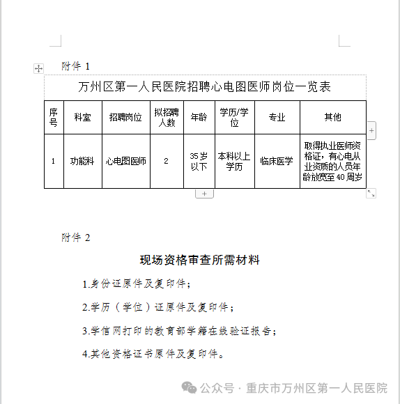 根据医院工作需要,现面向社会招聘心电医师,本次招聘坚持公开、平等、竞争、择优原则,按照德才兼备的标准,采取考试和考察相结合的方式进行。 一、招聘人数 本次面向社会招聘心电图医师2名,具体岗位详见《万州区第一人民医院招聘工作人员岗位一览表》(附件1)。 二、招聘范围和对象 (一)基本条件 1.具有中华人民共和国国籍; 2.遵守宪法和法律; 3.具有良好的品行; 4.适应岗位要求的身体条件; 5.符合岗位所需的其他条件。 (二)年龄计算 本简章所要求的年龄计算截止时间为2024年3月14日;本简章中所指“以上”“以下”均包含本级(数),如35周岁以下,均含35周岁。 三、报名及资格审查 本次公开招聘采取现场报名方式进行,资格审查所需材料详见《现场资格审查所需材料》(附件2)。 报名地点:院人事科(本院行政办公楼3楼) 报名截止时间:2024年3月14日。 四、考试考核 本次招聘主要采取笔试+面试方式进行。(若报名未超过3:1,则采取直接面试方式进行) (一)笔试。 笔试分值100分,采取闭卷形式,笔试时间另行通知。 (二)面试。 面试采取结构化面试方式进行,面试分值为100分,报考人员不按规定时间、地点参加面试的,视为自动放弃面试资格。 五、体检 根据考试考核总成绩从高到低1:1等额确定体检人选。 本简章由万州区第一人民医院人事科负责解释。 咨询电话:023-58376003 附件: 1.万州区第一人民医院招聘工作人员岗位一览表 2.现场资格审查所需材料