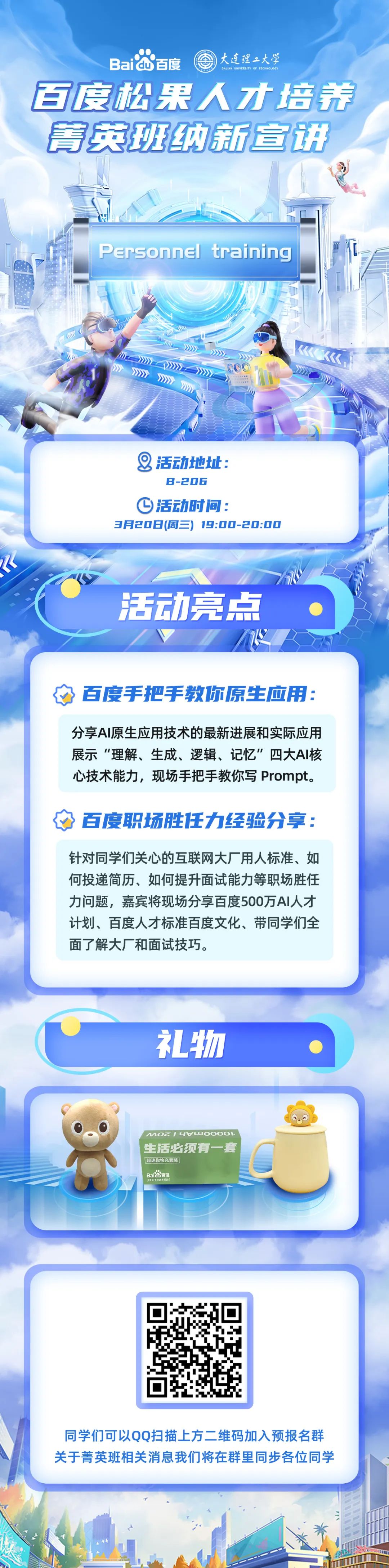 招新宣讲 ![]() 百度松果人才培养菁英班招生选拔 为深入推进校企联合人才培养,加强我校创新型、应用型、技能型等复合型人才培养,投身我国人工智能工程建设,我校联合百度设立百度松果人才培养菁英班,面向计算机类相关学科及其交叉领域相关专业选拔优秀学生进行培养。现将2024大连理工大学-百度松果人才培养菁英班招生选拔事宜通知如下。 ![]() 菁英班 纳新宣讲 时间:3月20日(周三)19:00-20:00 地点:开发区校区教学楼B-206 ![]() 菁英班简介 ![]() 百度是拥有强大互联网基础的领先AI公司。百度以“用科技让复杂的世界更简单”为使命,坚持技术创新,致力于“成为最懂用户,并能帮助人们成长的全球顶级高科技公司”。基于搜索引擎,百度演化出语音、图像、知识图谱、自然语言处理等人工智能技术;在云、AI、互联网融合发展的大趋势下,百度形成了移动生态、百度智能云、智能交通、智能驾驶及更多人工智能领域前沿布局的多引擎增长新格局,积蓄起支撑未来发展的强大势能。 百度联合大连理工大学设立百度松果人才培养菁英班,从计算机学科及其交叉领域相关专业中选拔优秀学生,实行更高的培养标准和灵活的教学模式,培养贯通人工智能理论、方法、技术、产品与应用等的纵向复合型人才,以及掌握“人工智能+”经济、社会、管理、标准、法律等的横向复合型人才,加强创新、应用和技能多重层次技能提升。 ![]() 报名条件 及招生人数 学院大二、大三、研一等在读学生(也欢迎低年级博士生报名),热爱计算机、人工智能技术,需具备一定编程技能,ACM竞赛等国家级及以上获奖选手可优先破格录取。 ![]() 培养方式 “菁英班”培养周期为一年,自2024年3月至2024年12月,学员将参加人工智能相关产业课程、题库练习、项目实践、技术竞赛、生涯指导等阶段性学习。报名菁英班的同学须全程参与菁英班各项学习及竞赛活动。 1、课程学习:由百度提供课程资源,包括人工智能相关教学资源包、职场规划线上线下课程、同时提供数据、竞赛培训指导、图书课件、算力资源等实训平台等。 2、题库平台:百度将提供菁英班学生海量题库练习,包括TIPCC题库、清华大学出版社名师题集、百度经典竞赛活动百度之星、大数据竞赛等进行提炼出1000+编程题目,以及完整全套源代码和详细解析解题思路,百度将组织不定期比赛,并对成绩优异者进行奖励激励。 3、竞赛活动:百度将组织菁英班学生参与由百度组织的高校竞赛,如中国高校计算机大赛—人工智能创意赛(已列入国赛榜单)、百度之星程序设计大赛(已列入国赛榜单)。 4、科研交流:百度将根据课程安排邀请百度内部工程师与菁英班同学进行线下知识分享交流,对学生上报的研究课题,待审核通过后,可根据需要按照相关办法邀请百度内部专家作为企业导师进行指导。同时百度将根据需要提供菁英班学生到百度参观、实习的机会。 5、团队建设:百度将组织菁英班学生定期开展团队建设活动。 6、评优表彰:在完成全部学习内容后,全体菁英班学员需进行结业考试,并向优秀学生给予适当激励并颁发荣誉证书。 请有意向的同学请扫描下方二维码加入预报名群进行报名 (后续相关信息将在群中发布) ![]() ★ 阳光心理健康协会“新学期 从‘心’出发”开学心理第一课圆满举行★ 校招快讯 | 三月校招日历,请查收(一)★ 软件学院、国际信息与软件学院2024年寒假社会实践中期纪实【科技创新报国团专题】 |