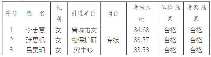 根据《中共晋城市文化和旅游局党组关于引进高层次人才的实施方案》的要求,经过报名、资格审查、面试、考察、体检等环节,现将拟引进人员名单公示,名单见附件。