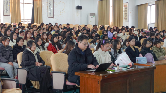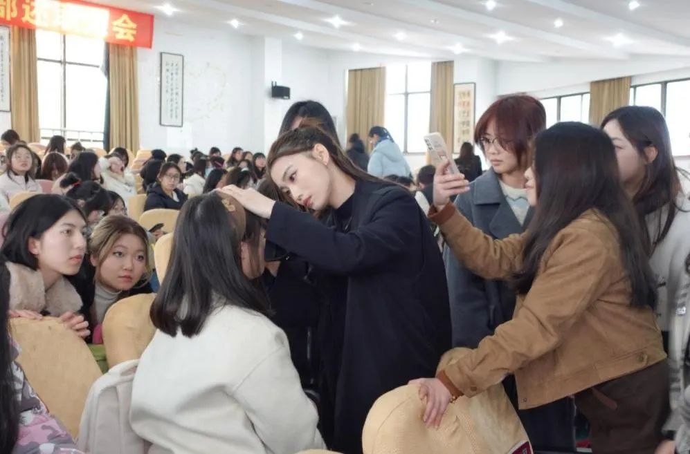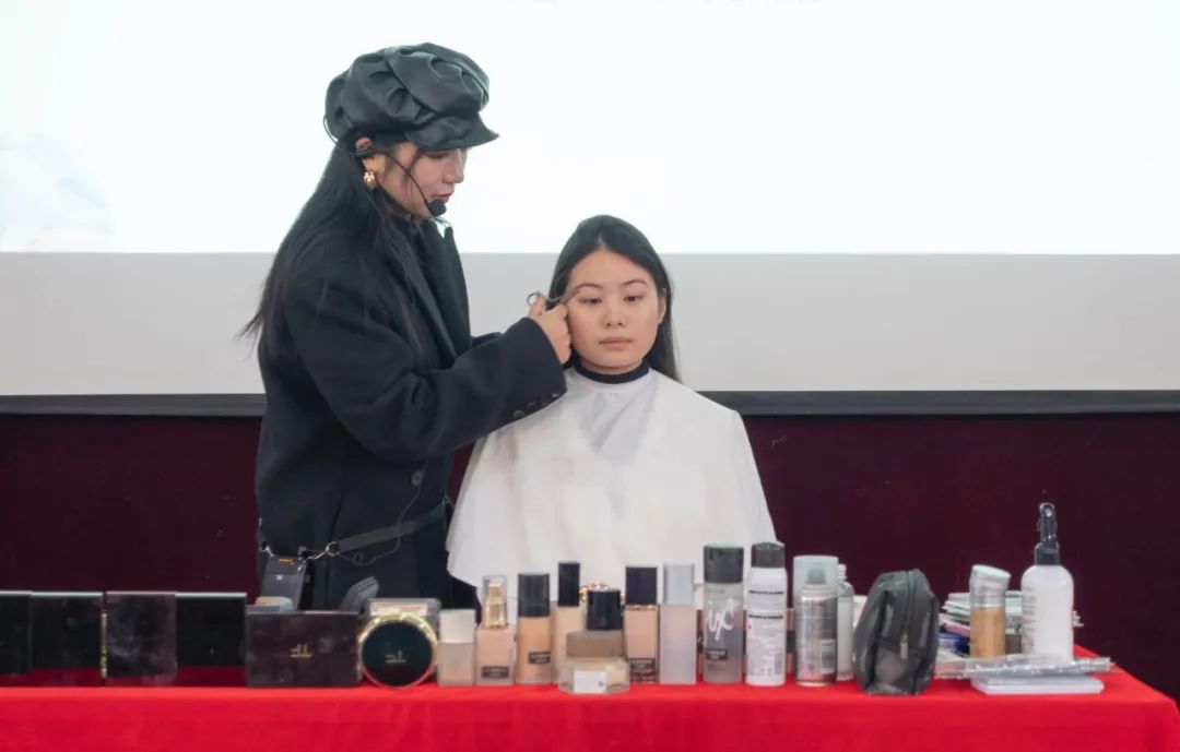 蔡老师以《热辣滚烫·妆点青春》为题,从第一印象、专业印象、职业发展等多方面强调职场形象管理的重要性。她详细分享专业化妆知识理论,细致全面地分析职场妆容化妆技法。蔡老师及其团队为加强同学们对化妆技法的理解,还在现场进行改妆实操,现场同学积极互动交流,大家纷纷表示收获颇多。
