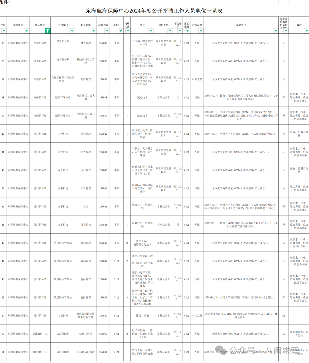详见《东海航海保障中心2024年度公开招聘工作人员职位一览表》(附件1)。
