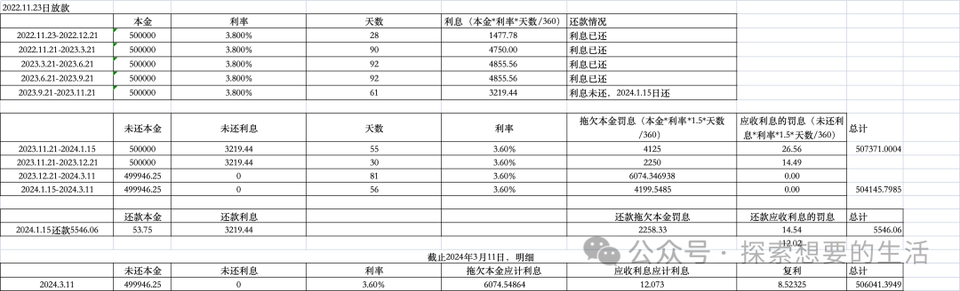 上午,银行工作人员把今天的对方欠息的各部分截图过来了,我按照系统里的数据,通过与银行人员沟通,了解了拖欠本金应计利息增量的意思(就是本金按照罚息利率每天产生的钱),反推出来银行是从2023年12月21日开始计算本金利息这些,而不是按照还款人在2024年1月15日那天还款开始算。还有里面的应收利息应计利息的12.073元以及复利的8元多,我研究了半天,研究出来应收利息应计利息应该是还款人换的应收利息的罚息没全还完,剩下的12.073元。然后这里的复利,是跟银行的法务部沟通才知道是“拖欠本金的罚息和应收利息的罚息”再按照罚息利率算(但是我到现在还没搞明白是以哪一天的数据来算),当然对方也说这个计算方式很复杂,按照系统来的就是了。厘清了这个计算方式后,带教老师让我写个变更诉讼请求申请书,按照今天的数据来变更诉讼请求。