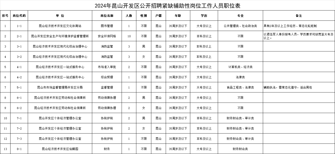 点击蓝字关注我们,尚众陪你考公 2024年昆山开发区公开招聘紧缺辅助性岗位工作人员简章 因工作需要,经研究决定,面向社会公开招聘辅助性岗位工作人员31名。现将有关事项公布如下: 一、招聘岗位 招聘岗位及条件等详见《2024年昆山开发区公开招聘紧缺辅助性岗位工作人员职位表》(附件1)。 二、招聘对象 凡符合本次公开招聘的基本条件及招聘岗位所需专业技能、身体等条件的人员,均可报名。 三、资格条件 1.具有中华人民共和国国籍,遵守中华人民共和国宪法和法律,拥护中国共产党领导和社会主义制度。 2.遵纪守法,品行端正,团结同志,廉洁奉公。 3.具备正常履行职责的身体条件和心理素质。 4.具有符合职位要求的工作能力。 5.年龄35周岁及以下(即1988年3月15日及以后出生)。 6.具有国家承认的相应学历,“专业”设置目录为《江苏省2024年度考试录用公务员专业参考目录》(附件2)。目录不按照“学科门类”、“一级学科”、“二级学科”的结构划分;目录中第2列为“大类”名称,第3、4、5列为各学历层次具体专业名称,具体专业之间不存在包含与被包含的关系。 7.昆山户籍(以户口本为准,户口必须在2024年3月15日及以前迁入)。 8.报考岗位有工作经历要求的,工作经历按实累积计算,计算的截止时间为2024年3月15日,以社保缴费清单代为证明。自主创业、灵活就业人员,也可视为具有工作经历。自主创业并办理工商注册手续的人员,其工作经历时间自营业执照颁发之日算起。以灵活就业形式初次就业人员,其工作经历时间从登记灵活就业并经审批确认的起始时间算起。在高校期间的社会实践经历,不能视为工作经历。 9.归国留学人员另须出示国家教育部留学服务中心出具的《国外学历学位认证书》。 10.具备《2024年昆山开发区公开招聘紧缺辅助性岗位工作人员职位表》中报考岗位要求的其他资格条件(《2024年昆山开发区公开招聘紧缺辅助性岗位工作人员职位表》中对招聘岗位基本条件和其他资格条件另有规定的从其规定)。 11.有下列情形之一的,请不要报考: (1)现役军人; (2)普通高校在读的高校生(已取得学历证书、学位证书的2024年毕业生除外); (3)被辞退未满5年的原机关、事业身份的工作人员; (4)在国家法定考试中被认定有舞弊等严重违反纪律行为人员; (5)尚未解除纪律处分或者正在接受纪律审查的人员、刑事处罚期限未满或者涉嫌违法犯罪正在接受调查的人员; (6)与用人单位负责人员有夫妻关系、直系血亲关系、三代以内旁系血亲关系或者近姻亲关系等亲属关系的,不得应聘组织(人事)、纪检监察、审计财务岗位;与现有在岗人员存在上述关系的,不得应聘到岗后形成直接上下级领导关系的管理类岗位,以及《事业单位人事管理回避规定》明确应当回避的岗位; (7)有其他不良情况或行为,不宜从事所招聘岗位工作的人员。 四、报名和资格初审 报名方式 本次公开招聘采用网络报名的方式进行。 报名系统网址 昆山人力资源市场考试报名系统(网址:exam.kshr.cn) (建议采用电脑端登录系统) 报名时间 2024年3月15日09:00-2024年3月19日15:00 报名时需上传本人正面免冠彩色标准证件照,JPG格式,30KB以下。 资格初审时间 2024年3月15日09:00-2024年3月20日15:00 (双休日、工作日16:30至次日09:00除外) 缴费时间及方式 2024年3月15日09:00-2024年3月20日16:00 缴费采取微信扫码支付方式,报名费100元/人。通过资格初审的人员在网上完成缴费方视为报名成功,逾期不办理网上缴费手续的,视为放弃。 笔试开考比例及补报规则 本次招聘笔试开考比例为1:3。报名、资格初审结束后达不到开考比例的岗位,根据实际情况核减招考计划。 应聘岗位被取消的报名成功人员可在2024年3月21日09:00-16:00,联系昆山人力资源市场考试培训中心进行岗位改报或退费(联系电话:0512-55137246),逾期作放弃处理。 报名操作流程注意事项 (请务必仔细阅读) (1)报名信息提交后,处于等待审核过程中无法再次修改信息及岗位。资格初审通过后,不得更改报名信息,不得改报其他岗位,通过初审并完成缴费后,报名方为有效。 未通过资格初审的应聘人员,在报名截止时间之前,可再次修改报考信息或改报其他岗位,逾期未通过资格初审的,视为无效报名。 (2)应聘人员提交报名信息后,请耐心等待工作人员审核(初审工作时间不超过24小时),及时登录报名系统关注初审结果,因未及时修改报名信息、未在规定时间内完成报名缴费而导致报名无效的,责任由应聘人员自负。 (3)应聘人员如对初审结果有异议,可在缴费截止时间之前联系昆山人力资源市场考试培训中心进行申诉(联系电话0512-55137246),逾期视为放弃申诉资格。 (4)请应聘人员务必及早报名(因“踩点”报名,导致无充足修改时间而报名无效的后果由考生自负),仔细核对岗位及自身条件,如实、完整、准确填报报名信息,提高报名成功率,尽量一次性通过资格初审。 (5)每人只能选择一个岗位进行报名。应聘人员须用在有效期内的第二代居民身份证进行报名,报名信息与考试时使用的身份证必须一致,因身份证不一致而造成不能如期参加考试的,责任由应聘人员自负。 (6)应聘人员务必按照系统设置要求如实填写、上传相关资料,未按规定填写、上传的,造成审核不通过或其他问题的,责任由应聘人员自负。 部分系统设置内容填报提醒如下: ① 是否存在不得报考情况: