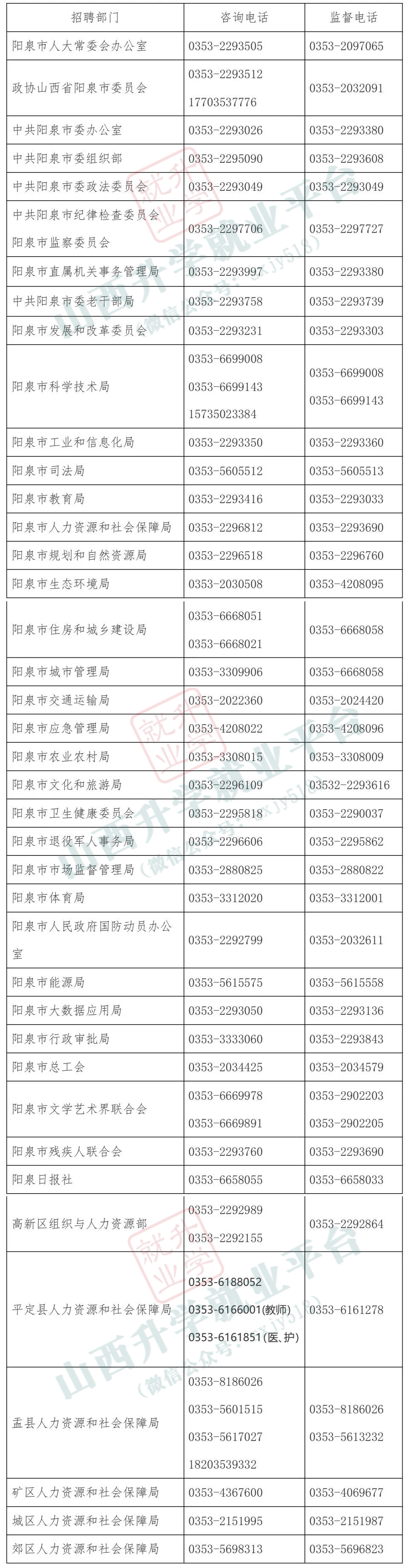 👉阳泉市市县两级事业单位 2024公开招聘工作人员岗位表.xls 下载招聘岗位及相关资料,点击关注:报名 报名时间 2024年3月18日9:00至2024年3月22日17:00。 报考人员须在规定时间登录阳泉市人力资源和社会保障局网站(人社考试专题)(http://rsj.yq.gov.cn/),提交报名申请,填写《报名登记表》。 资格初审 资格初审由各招聘单位主管部门、各县区人社局负责。报考人员可在提交报考信息后,登录阳泉市人力资源和社会保障局网站(人社考试专题)查询资格审查结果。通过资格审查的,不能再报考其他岗位。 网上缴费 通过资格审查的考生按网上提示的缴费办法在2024年3月24日17:00前进行网上缴费,缴费标准为每人每科50元,未按期缴费的,视为自动放弃考试。 补报名 补报名时间为2024年3月28日9:00至17:00,补报名资格审查时间为2024年3月28日9:00至24:00,缴费时间为2024年3月29日17:00前。网上报名期间已完成报名的不得参加补报名。 考务及网上报名技术咨询电话:0353—2295107 下载打印准考证 笔试 咨询、监督电话 阳泉市市县两级事业单位2024年公开招聘工作人员公告为进一步加强人才队伍建设,改善事业单位工作人员队伍结构,根据《事业单位人事管理条例》、《关于进一步改进和加强事业单位公开招聘工作的意见》(晋人社厅发〔2017〕35号)《关于做好2024年全省事业单位公开招聘工作的通知》(晋人社厅发〔2023〕88号)和《关于做好2024年全市事业单位公开招聘工作的通知》(阳人社发〔2024〕3号)等政策规定和要求,结合市委组织部、市人社局下达的招聘计划,经研究面向社会公开招聘工作人员857名,现公告如下: 一、招聘原则 (一)坚持德才兼备的原则; (二)坚持公开、平等、竞争、择优的原则; (三)坚持政府宏观管理与落实用人单位自主权相结合的原则; (四)坚持按需设岗、按岗招聘的原则; (五)坚持优化结构、保障重点的原则。 二、招聘对象 符合招聘条件和岗位所需具体要求的应往届高校毕业生(不含2024年毕业的委培生、定向生)、职业院校(含技工院校)毕业生、服务基层项目人员、退役大学生士兵。 “高级职称或博士岗位”招聘对象为具有副高级及以上职称专业技术人员或博士研究生(非在职)。 三、招聘条件和资格 (一)具有中华人民共和国国籍; (二)遵守中华人民共和国宪法和法律; (三)具有良好的品行; (四)具备正常履行职责的身体条件、心理条件; (五)具有岗位所需的学历学位、专业或技能条件(报考者的学历需国家教育行政部门认可。2024年普通高校应届毕业生的,其毕业证书及学位证书须在2024年7月底前取得;参加自学考试、成人考试等教育形式的报考者,其毕业证书及学位证书须在2024年3月11日前取得); (六)年龄一般在18周岁以上、35周岁以下(即1988年3月11日至2006年3月11日期间出生,岗位要求为30周岁及以下为1993年3月11日至2006年3月11日期间出生,岗位要求为25周岁及以下为1998年3月11日至2006年3月11日期间出生),引进高层次和急需紧缺专业人才时,年龄可适当放宽到40周岁(即1983年3月11日及以后出生)。 (七)具备报考岗位所要求的其他资格条件。 1.按照国家和我省有关政策规定,港澳地区的中国公民和台湾同胞在事业单位公开招聘中享有公平竞争权利,可应聘到内地事业单位就业,应聘人员须具备招聘岗位所需的专业或技能等相应条件。 2.本次招聘专业要求按照教育部最新公布的本科和研究生招生专业设置,其中本科按照“阳光高考”专业知识库设置,研究生按照“中国研究生招生信息网”专业知识库设置。 高校自主设置的研究生专业、专业学位领域调整前的专业、海外学历学位的专业、技工院校专业等未列入的,由负责资格审查部门根据主要课程、研究方向等进行认定。 历次本科专业目录调整、学位授予和人才培养学科目录调整、专业学位领域调整前的专业,按照调整前后的对应关系认定。 在符合专业等其他条件的前提下,技工院校预备技师(技师)班毕业生可报名应聘学历要求为大学本科的岗位,高级工班毕业生可报名应聘学历要求为大学专科的岗位。 3.要求教师资格证的岗位,报考者教师资格证书的学科学段应与岗位要求的学科学段一致;同学科高学段教师资格证可向下融通,但是,要求幼儿园教师资格证的岗位,不允许高学段向下融通。 2024年普通高校应届毕业生的教师资格证须在2024年7月底前取得;参加自学考试、成人考试等教育形式人员的教师资格证须在公告发布之日前取得。 4.经住培合格的本科学历临床医师,按临床医学、口腔医学、中医专业学位硕士研究生同等对待,可报考卫健系统所属医疗卫生机构学历学位要求为硕士研究生的岗位(住培证书中的培训专业须与岗位要求的专业一致)。 5.根据相关要求,本次公开招聘设置应届毕业生专门岗位、服务基层项目人员专门岗位和退役大学生士兵专门岗位。 (1)应届毕业生专门岗位报考对象包括:纳入国家统招计划、被普通高等院校录取的2024年应届高校毕业生;参加服务基层项目前无工作经历的,服务期满且考核合格后2年内的人员;国家统一招生的普通高校毕业生离校时和在择业期内(国家规定择业期为二年)未落实工作单位,其户口、档案、组织关系仍保留在原毕业学校,或者保留在各级毕业生就业主管部门(毕业生就业指导服务中心)、各级人才交流服务机构和各级公共就业服务机构的毕业生;2022年1月1日