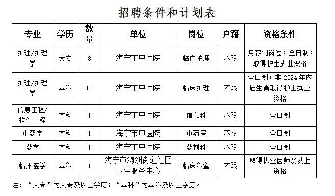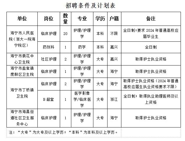 海宁市人民医院医疗集团 2024年3月 编外岗位合同制人员招聘公告 根据《海宁市卫生系统招聘编外岗位合同工实施办法》及相关规定,结合单位业务现状和用人需求,现就海宁市人民医院医疗集团招聘编外岗位合同制人员的具体事项公告如下:报名时间:2024年3月13日(周三)上午9:00~10:30、下午14:00~15:30。报名地点:海宁市人民医院(海宁市钱江西路2号)行政楼六楼6A19。(一)具有良好的职业道德,遵纪守法,身体健康,能适应专业技术岗位工作要求。(二)具备拟聘用岗位所需的学历、专业、户籍、专业技术资格、执业资格等要求。对有户籍要求的岗位,以2024年3月13日的户口所在地为准,截止到2024年3月13日户口尚在迁移中的人员,不受理报考。(三)年龄18~35周岁(1988年3月13日至2006年3月13日期间出生)。应聘人员在规定时间内凭毕业证书[2024年应届毕业生未取得毕业证书和学位证书的提供学校核发的《就业推荐表》、教育部学生司制发的《全国普通高校毕业生就业协议书》(省外高校可持省级教育行政部门制发的《普通高校毕业生就业协议书》);留学人员须提供教育部中国留学服务中心出具的国外(境外)学历学位认证书,相关的证明材料]、有效期内身份证、户口簿及招聘岗位要求的其他材料等原件及复印件到报名指定地点公开报名,进行资格审核,填写《海宁市事业单位编外合同工公开招聘报名表》1份,并提供近期一寸照片1张,每人限报1个岗位。1.总院护理岗位:采取笔试(内容为岗位相关专业知识)、操作考试、面试相结合方式进行,笔试后按笔试成绩从高分到低分按招聘岗位数1:2的比例确定操作考试、面试人选,按笔试成绩30%、操作考试成绩30%、面试成绩40%的比例计算综合成绩,综合成绩低于60分的不予聘用。2.医共体成员单位护理岗位:采取笔试、面试相结合方式进行,笔试、面试考核内容为岗位相关专业知识。笔试后按笔试成绩从高分到低分按招聘岗位数1︰2的比例确定面试人选,不足1︰2的按实际人数确定入围面试人选;按笔试成绩、面试成绩各占50%计算综合成绩,综合成绩低于60分的不予聘用(面试总分为100分,面试成绩低于60分者,不能列入体检、考察人选)。3.其他岗位:报名人数达到招聘人数3倍的,采取笔试(内容为岗位相关专业知识)、面试相结合方式进行,笔试后按笔试成绩从高分到低分按招聘岗位数1:3的比例确定面试人选,按笔试成绩、面试成绩各占50%计算综合成绩,综合成绩低于60分的不予聘用(面试总分为100分,面试成绩低于60分者,不能列入体检、考察人选);报名人数不足3倍的直接采取面试方式进行考核(内容为岗位相关专业知识),面试成绩低于60分的不予聘用。4.考试时间、地点视报名情况确定并另行通知,未按规定时间、地点参加考试的,视作放弃本次招聘。考试工作结束后,根据成绩从高分到低分按岗位招聘计划数1∶1比例确定体检、考察人员。体检标准原则上参照公务员录用标准执行。体检对象不按规定的时间、地点参加体检的,视作放弃。体检结束后进行考察。报考人员放弃体检或体检不合格(可申请一次复检,仍不合格的)、考察结论为不宜聘用的、在办理聘用手续前放弃聘用资格的,在成绩合格人员中按成绩从高分到低分依次递补(面试不合格的人员不列为递补对象)。根据考试、体检、考察的结果,确定拟聘用对象,并在海宁市人民政府门户网站、市卫生健康局(http://www.haining.gov.cn/col/col1460443/index.html)网站公示3天。公示期满后,没有反映问题或反映有问题经查实不影响聘用的,由用工单位依据《劳动合同法》与聘用人员签订劳动合同,按规定办理相关社会保险和住房公积金手续(2024年应届毕业生且尚未拿到毕业证的,自经公示明确为聘用对象后30天内须与应聘单位签订就业协议,逾期视作自动放弃处理;同时须于2024年9月30日前取得学历、学位证书)。对反映有影响聘用问题并查有实据的,不予聘用;对反映的问题一时难以查实的,将暂缓聘用,待查清后再决定是否聘用。被聘用人员收到聘用通知后,在规定的报到时间办理报到手续,逾期不报到者,作自动放弃。聘用人员实行人事代理和试用期制度,试用期满后经考核不合格的予以解聘。招聘过程信息均在医院官方平台公布,届时考生可自行查询。咨询电话:0573-89230025;87036229监督电话:0573-89230011,87017385,87017301海宁市中医院医疗集团 2024年3月 编外岗位合同制人员招聘公告 根据《海宁市卫生系统招聘编外岗位合同工实施办法》及相关规定,结合单位业务发展和用人需求,现就2024年3月海宁市中医院医疗集团面向社会公开招聘编外合同制人员具体事项公告如下:报名时间:2024年3月13日(周三)上午8:30~11:00。报名地点:海宁市中医院(海宁市长埭路177号)6号楼(北门左侧10层楼)301会议室招聘报名处。(一)具有良好的职业道德,遵纪守法,作风正派,有较强的工作责任心和事业心,身体健康,能胜任相应岗位的工作。(二)具备拟聘用岗位所需的学历、专业、专业技术资格、执业资格等要求。(三)年龄要求:18~35周岁(1988年3月13日至2006年3月13日期间出生)。中级及以上职称年龄可适当放宽。应聘人员在规定时间内凭毕业证书[2024年应届毕业生未取得毕业证书和学位证书的提供学校核发的《就业推荐表》、教育部学生司制发的《全国普通高校毕业生就业协议书》(省外高校可持省级教育行政部门制发的《普通高校毕业生就业