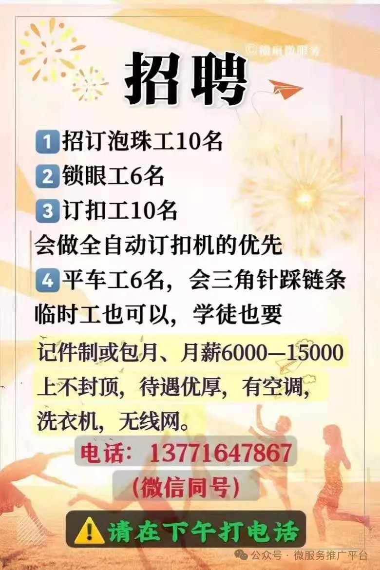 + e 需要 付 费 发 布 获取更多信息 加微信 15895503723 找工作的可以关注公众号 “吴江横扇信息平台” 名座美容SPA养生横扇店现招聘 美容学徒(10名):3000-5000 美容师(5名):5000起 美发学徒:工资面议 发型师(10名): 5000起 美容经理:年薪15万之30万(有管理经验) 联系电话:18962509299 厂房出租:叶家港菜市场附近有270平方,底层车间出租,可放24台大电脑,配套齐全、交通方便,有需要的房客可看房洽谈即可入往,联系:18120094896 一对一抖音主播 运营 客服 助播培训, 学会后可介绍工作,联系电话13004568807 微信szy1999426 出租:亭子港南面有四楼四底房子, 另有位于娘娘庙路口往北100左右有两间门面房,带楼 可以住人 可以做饭 适合放平机 套口机,价格面谈, 联系电话18913713968贺女士 好消息!宏明特种纱入驻横扇了 总店地址:横扇镇环河路1317号 分店地址:庙港镇富强南太湖大道店 本公司主营: 8支二经一纬、 4.5支三经一纬、 3.3支四经一纬、 5.8支八字纱、 15支冰曲、 24支双曲、 28支莱赛尔、 1.3公分,2公分,4公分,8公分仿貂毛,1.3公分至8公分珠片纱,各种常规及含羊毛彩虹渐变,段染、点子纱、全品类珠片纱,圈圈纱等精品春夏季纱、特种纱应有尽有,可定纺,可染色, 欢迎大家咨询。 联系电话:13356021338 招工 :因生产需要,现需招聘女工5名(短期工勿扰)主招女工,年龄18-50岁,可以缴社保,包工作餐,身体健康,手脚灵活,能吃苦耐劳,服从管理人员安排。能力越强工资越高。工厂地址:横扇镇思进路134号 ,联系人:汪总 13816983608, 13083606790 羊毛衫厂招聘 14针熟练挡车工一名 工资面议 要求:做长期有经验技术好的,电话18626161886 【出租】横扇镇厍港村一组32号雪落漾桥下第二路口有房出租,电话185 5026 3952 特价出售绵羊绒 酒红、深灰、浅粉、湖兰、两万三,1.1水晶大红两万六,另有纤绒纱、仿貂毛、绵羊绒现货,可定染 电话15262396678 【店面招租】店面房地址:横扇街道跃进路与域水路交叉口西侧,门牌号:跃进路501号。现有朝东店面房五间二层楼房,租金面议!