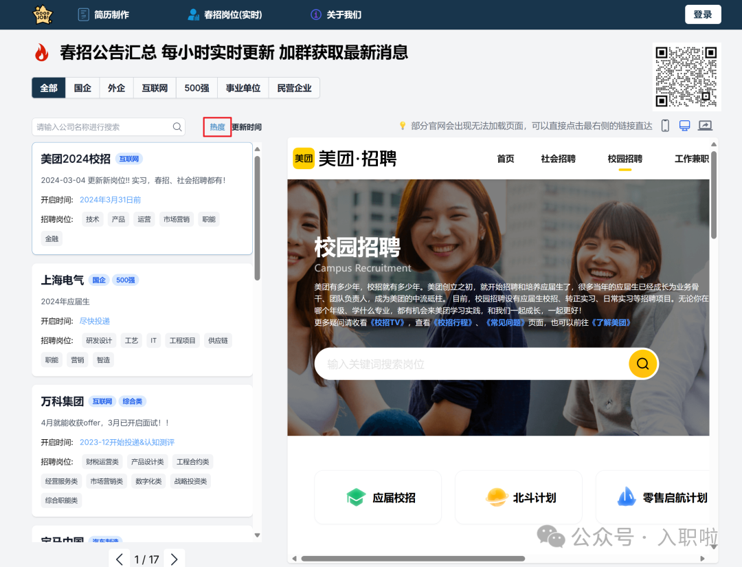 2024春招火热招聘中,大家还在为哪些公司,哪些岗位正在招聘信息来源发愁吗?小葵已经为您整理了几百条的岗位信息了 京东、得物、米哈游、拼多多、字节跳动、中铁集团、中国电信 等全部已经开启! 国企,民营,事业单位,外企,人才引进,500强 等不同单位性质的企业一直在火热招聘中,订阅入职啦公众号或者搜索入职啦(https://ruzhila.cn) 官网,免费获取更多的招聘信息,抓住春招,获得新的offer!