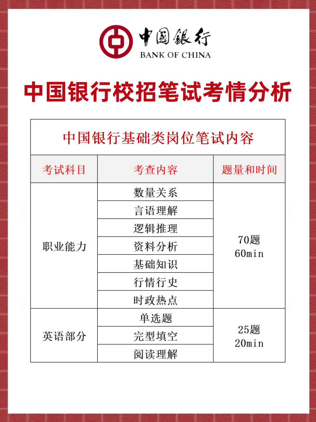 ![]() 中行春招网申时间:即日起-4月8日 中行春招笔试时间:3月23日(第一批)、4月20日(第二批) 中国银行笔试难度⭐⭐⭐⭐⭐ 根据中行秋招考情,笔试分岗位进行 基础类岗位 (营销岗位、综合服务岗) 职业能力+英语(80分钟) 信息科技类 (信息科技岗) 职业能力+英语+信科知识(120分钟) 金融综合类 (除信息科技岗外的总行、审计分行、管培生等) 职业能力+英语+综合知识(120分钟) 信息科技类+金融综合类 (同时入围多个岗位) 职业能力+英语+信科知识+综合知识(160分钟)