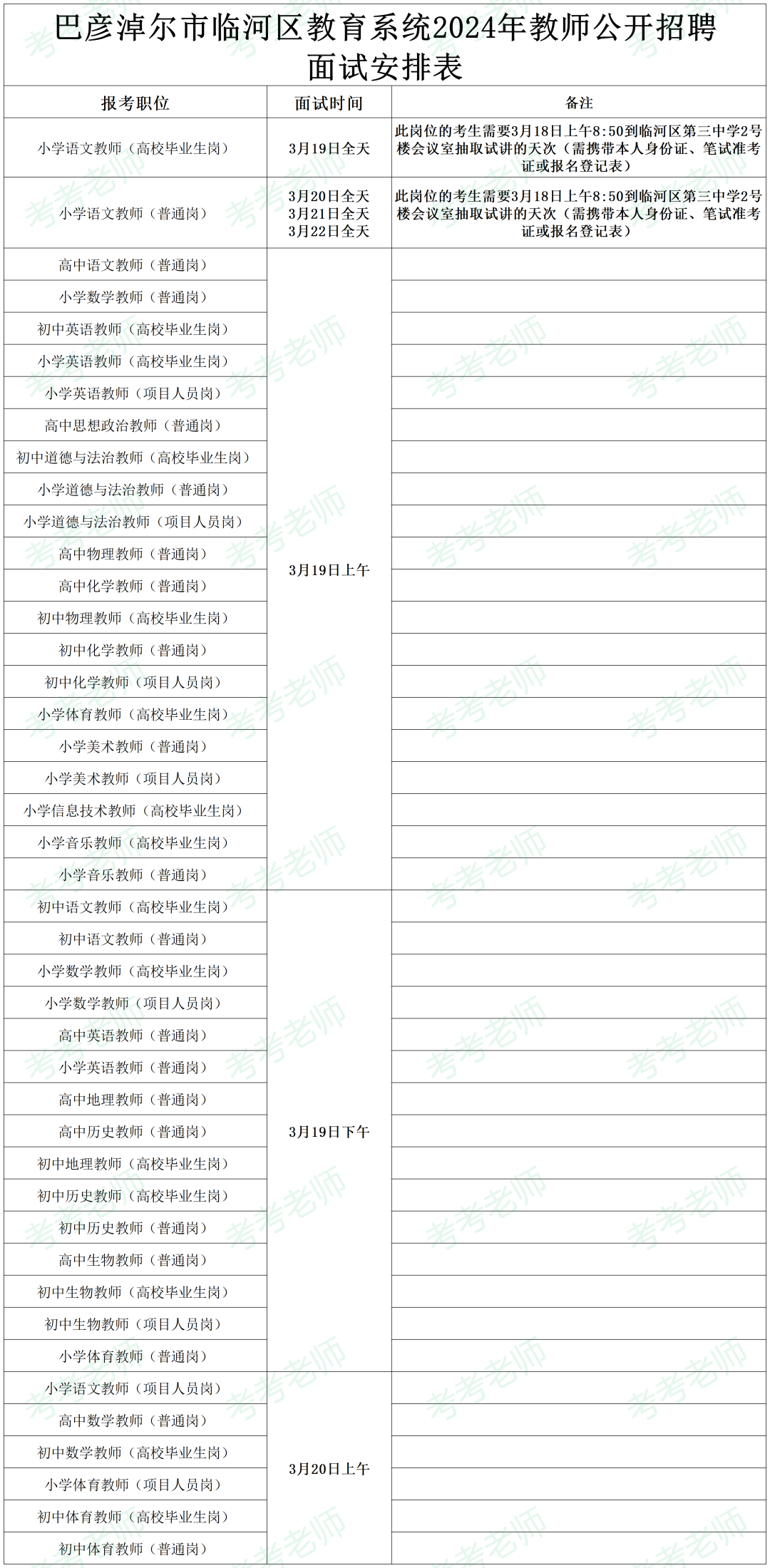 ![]() 按照《2024年度巴彦淖尔市教育系统公开招聘中小学教师公告》相关要求,现就临河区教师岗位面试相关事宜公告如下: 一、面试时间、地点 面试时间:2024年3月19日—3月22日(上午6:20,下午13:20) 面试地点:临河区第三中学综合楼 二、面试对象 面试对象为2024年报考临河区教师岗位且通过临河区教育局资格复审的应聘人员。 三、面试形式 (一)面试采取微型课试讲的形式进行,备课时间40分钟,授课时间不超12分钟,考生面对评委授课,没有学生,采取百分制办法计分。 (二)各学科试讲时不提供多媒体设备,体育学科试讲在室内。 (三)应聘临河区英语教师岗位的考生应使用国家通用语言文字和相应语言文字进行面试。其他岗位考生须使用国家通用语言文字进行面试,对不按要求面试的按零分处理。 四、场次安排 (一)请各位考生认真查看《巴彦淖尔市临河区教育系统2024年教师公开招聘面试安排表》(见附件),牢记面试时间。 ![]() (二)以下2个岗位由于参加面试人数较多,需要3月18日上午8:50到临河区第三中学2号楼会议室抽取试讲的天次(需携带本人身份证、笔试准考证或报名登记表)。 1.小学语文教师(高校毕业生岗) 2.小学语文教师(普通岗) 五、参加面试要求 (一)参加面试的考生,上午场次6:50准时开始抽取试讲节次(7:20第一节开始备课),下午场次13:50准时开始抽取试讲节次(14:20第一节开始备课)。考生需要提前半小时到达考点(上午6:20,下午13:20),以便完成核查工作,望各位考生提前做好准备。除参加考试考生外,其他与考试无关人员一律不得进入考点。 (二)考生参加面试时须携带本人身份证、笔试准考证或报名登记表。学科教材和备课用纸由面试地点提供,数学学科只提供三角板和圆规,音乐学科提供电子琴,体育学科提供足球、篮球、排球、体操垫。除去考场提供教具外,考生不得携带任何教具入场,否则按照违纪论处。 (三)考生入场后应主动将手机等通信设备及考试无关物品统一交由工作人员管理,严禁私藏、携带和使用任何通信工具和电子存储记忆录放设备。 (四)区教育局不再电话通知各位考生,请各位考生务必准时参加面试,上午场次6:50(下午场次13:50)仍未到候考室的考生,视为放弃本次面试。 (五)考生面试成绩须达到区教育局设定的面试最低合格分数线70分,方可进入下一环节。 (六)面试时,不得透露本人姓名或其他个人信息,不得着行业或特殊职业制服及明显带有特殊标记的配饰。 (七)校园内场地有限,无法停放车辆,请各位考生合理安排出行。 (八)面试期间,考生要自觉遵守考场秩序,服从现场工作人员安排管理,面试结束后按规定及时有序离场。 临河区教育局咨询电话:0478-7809886 0478-7809896 临河区教育局 2024年3月11日 ![]() 更多招考咨询 持续关注公众号“通辽考考老师”消息 |