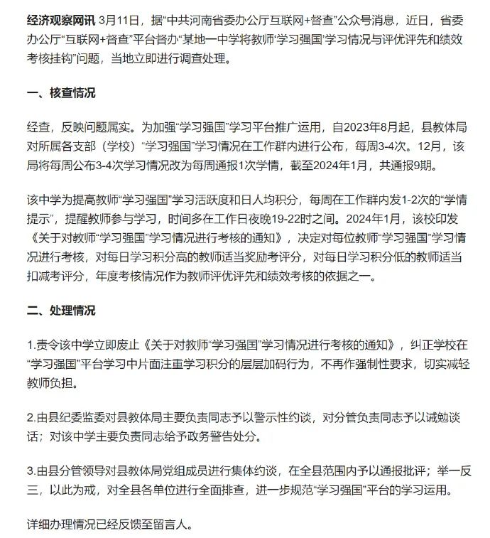 3月11日,官方称,反映问题属实。该中学每周在工作群内发1-2次的“学情提示”,提醒教师参与学习,时间多在工作日夜晚19-22时之间,并对每日学习积分高的教师适当奖励考评分,对每日学习积分低的教师适当扣减考评分,年度考核情况作为教师评优评先和绩效考核的依据之一。