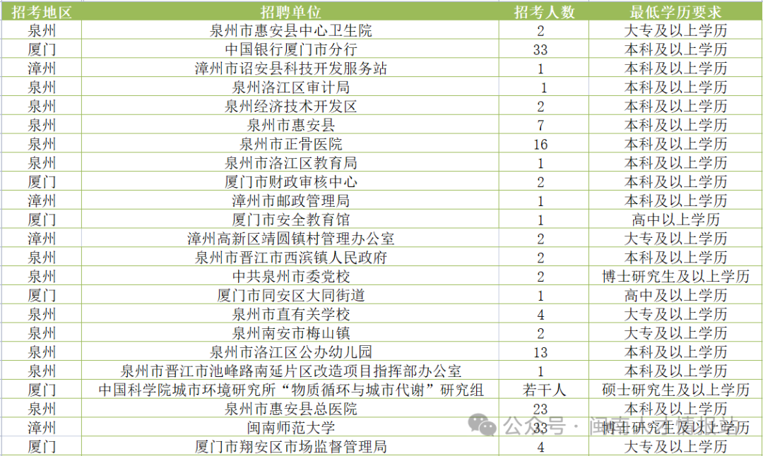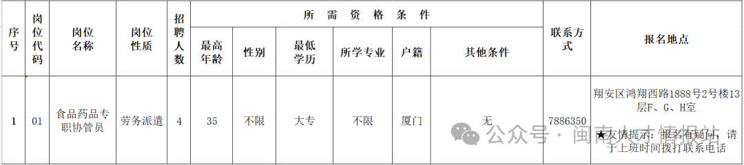 厦门市翔安区劳务派遣有限公司招聘简章(PQ2024002) ![]() 扫码加入群聊 查看更多闽南人才招聘资讯 ✅招聘单位:厦门市翔安区市场监督管理局 ✅招聘人数:4人 ✅报名时间:2024年03月11日~15日 ✅报名方式:现场报名 ✅报名地点:翔安区鸿翔西路1888号2号楼13层F、G、H室 ✅联系方式:7886350 ✅报名材料:报名人员需提供以下材料原件及复印件(复印件需依序装订成册): 1.报名表(见附件2) 2.有效身份证(正反面) 3.户口簿(首页和个人页) 4.近期正面免冠一寸彩色数码证件照(3张) 5.毕业证书原件和《教育部学历证书电子注册备案表》。 6.岗位要求的其他证明材料 ✅考核方式:笔试+面试。 ✅笔试形式:闭卷。题型为客观题。 ✅笔试内容:《综合基础知识》及相关专业知识 ✅笔试成绩:卷面分100分,笔试成绩=笔试卷面分+各项加分,笔试成绩合格线为60分。 ✅笔试时间及地点:笔试时间、地点待定。笔试前将在我司微信公众号(翔发人才翔安派遣)发布信息通知,报考人员凭身份证领取准考证。 ✅面试时间:面试前将在我司微信公众号(翔发人才翔安派遣)发布信息通知应聘人员凭身份证领取面试通知书,具体面试时间以通知书为准。 ✅面试人选:从笔试成绩达到合格线的应聘人员中,根据岗位拟聘人数与面试人数1:3的比例,从高分至低分确定面试人选;笔试成绩合格人数达不到规定比例的,按笔试成绩合格实际人数确定;实际参加面试人数与拟聘人数比例等于或低于1:1的,应聘人员面试成绩应达到70分(含)以上,方可进入体检。 ✅面试形式:结构化面试 ✅面试内容:主要测试应聘人员的综合素质和能力。 ✅面试成绩合格线:面试总分为100分,合格线为60分。 ✅综合总分计算:综合总分合格线为60分。 具体计算公式为:综合总分=笔试成绩×50%+面试成绩×50%。 部分岗位表预览 ![]() ![]() 扫码回复【3011】查看原文、下载岗位表 ![]() ![]() 扫码/关注回复【事业单位】查看公告汇总 往期推荐 |