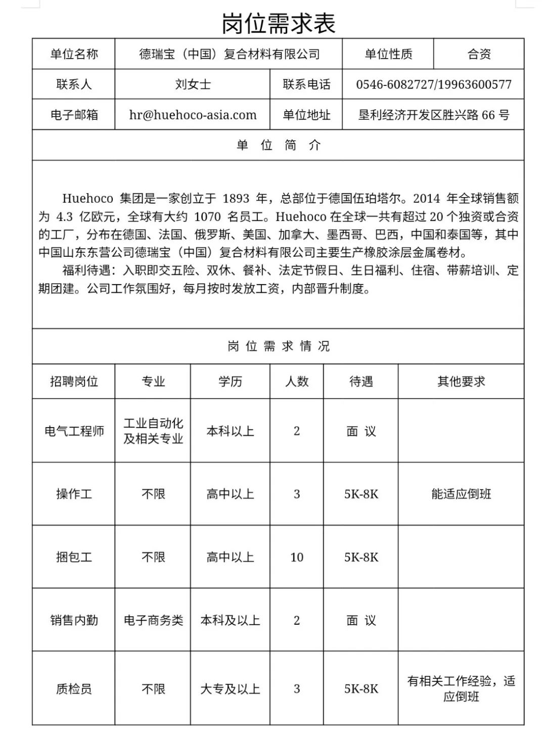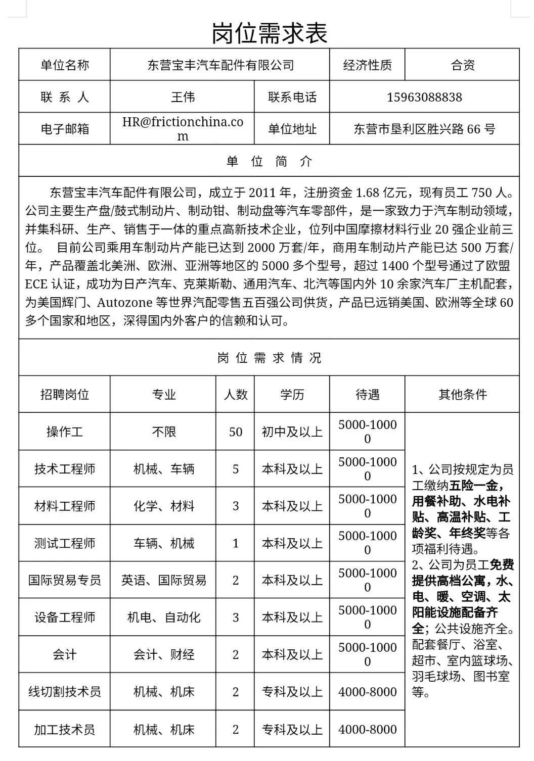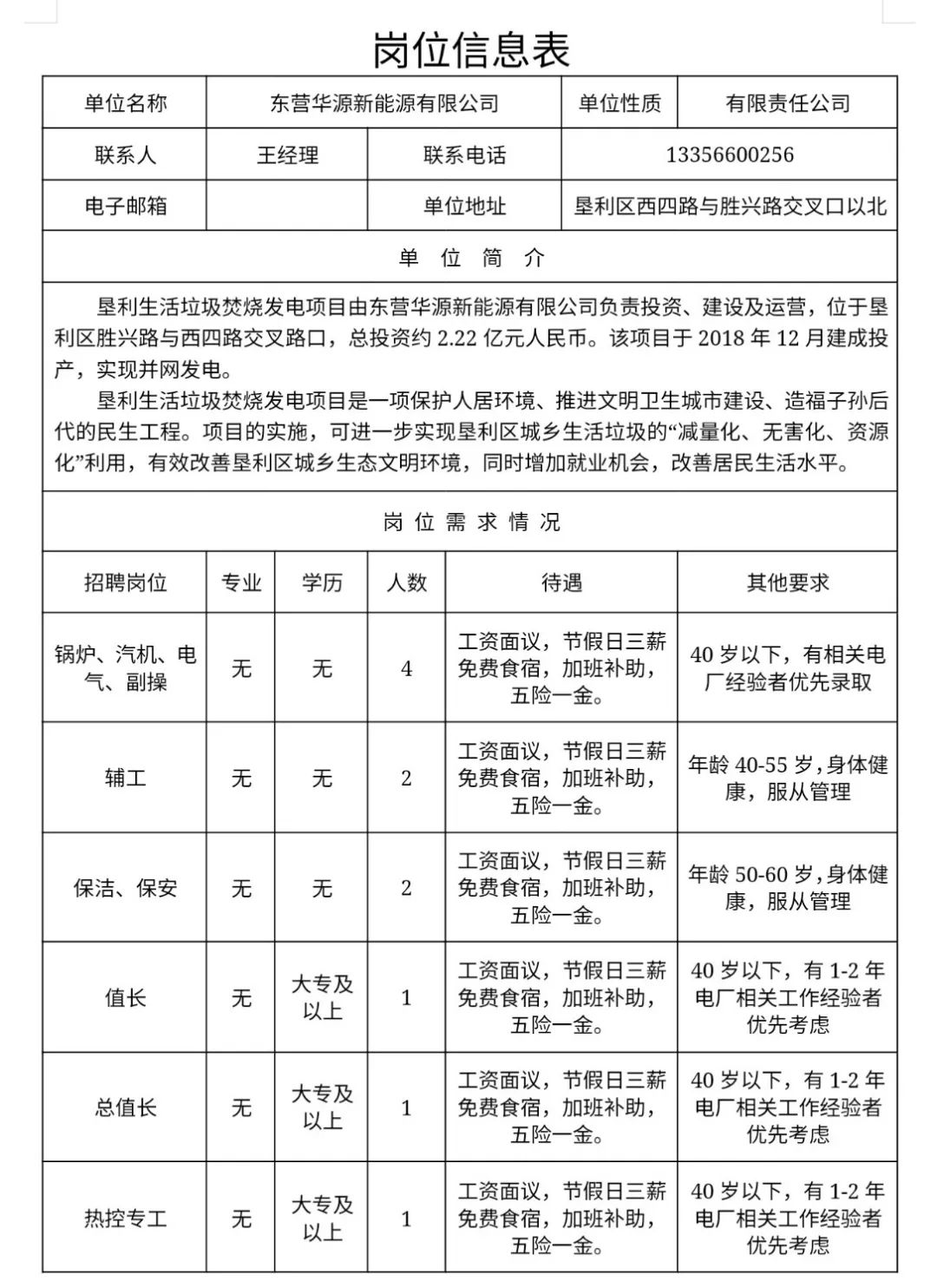 防骗提示 本站是垦利本地信息网站,所有信息均来自用户留言及第三方平台,注意凡是要求先打款(如押金/预付款/手续费等)均涉嫌诈骗!请勿上当! 招聘信息:垦利铁塔公司,位于新兴路黎源大厦院内,为国资委指定成立的央企下属公司,主营通信基础设施建设和维护,下属公司智联业务和能源业务。因业务发展需要,现需招聘营销经理一名,择优录取,要求如下: 1. 大专以上学历。主要工作面向政府、企业、物业小区对外联系市场业务,包括ICT\信息化、能源、充电桩、备电、换电等业务。 2. 工资待遇:五险一金,具体工资4000以上,视业务发展情况而议。 3. 有市场经验的优先,男女不限。 4. 年龄30岁至40岁之间,有能力者条件可适当放宽,周一至周五正常工作八小时,无需打卡,周六上午上班。 联系人:温,18805466001,微信同步。 垦利康复医院招聘养老护理员若干名 一、招聘条件 1、遵守中华人民共和国宪法和法律。 2、身体健康、富有爱心、吃苦耐劳、责任心强,具有良好的道德品行和奉献精神,有相关工作经验及养老护理员培训合格证者优先。 3、年龄要求:男女不限,60岁以下,有相关工作经验及养老护理员培训合格证者年龄可以适当放宽。 二、岗位职责 1、负责长者的日常生活起居照料,指导老年人合理饮食; 2、定期做好长者清洁、整理工作,按时巡查巡视,预防意外事件发生; 3、长者室内及户外活动时的安全照护; 4、按时总结、汇报,听取长者和家属意见,保证护理服务质量。 三、岗位待遇 试用期1个月,薪资4000-6000元 四、工作地点、联系电话 地 址:垦利 联系电话:13361506865(王女士) ![]()