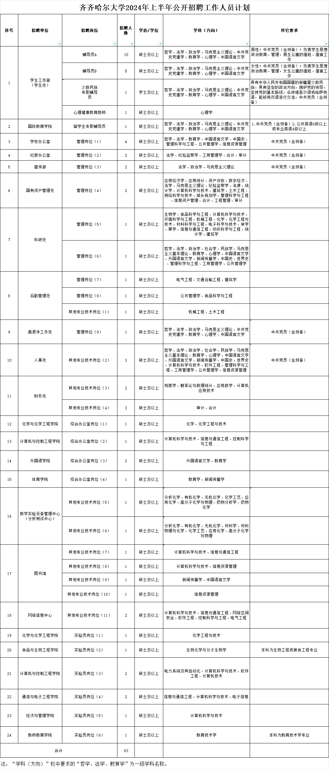 具体详见《齐齐哈尔大学2024年上半年公开招聘工作人员计划》(附件1)。