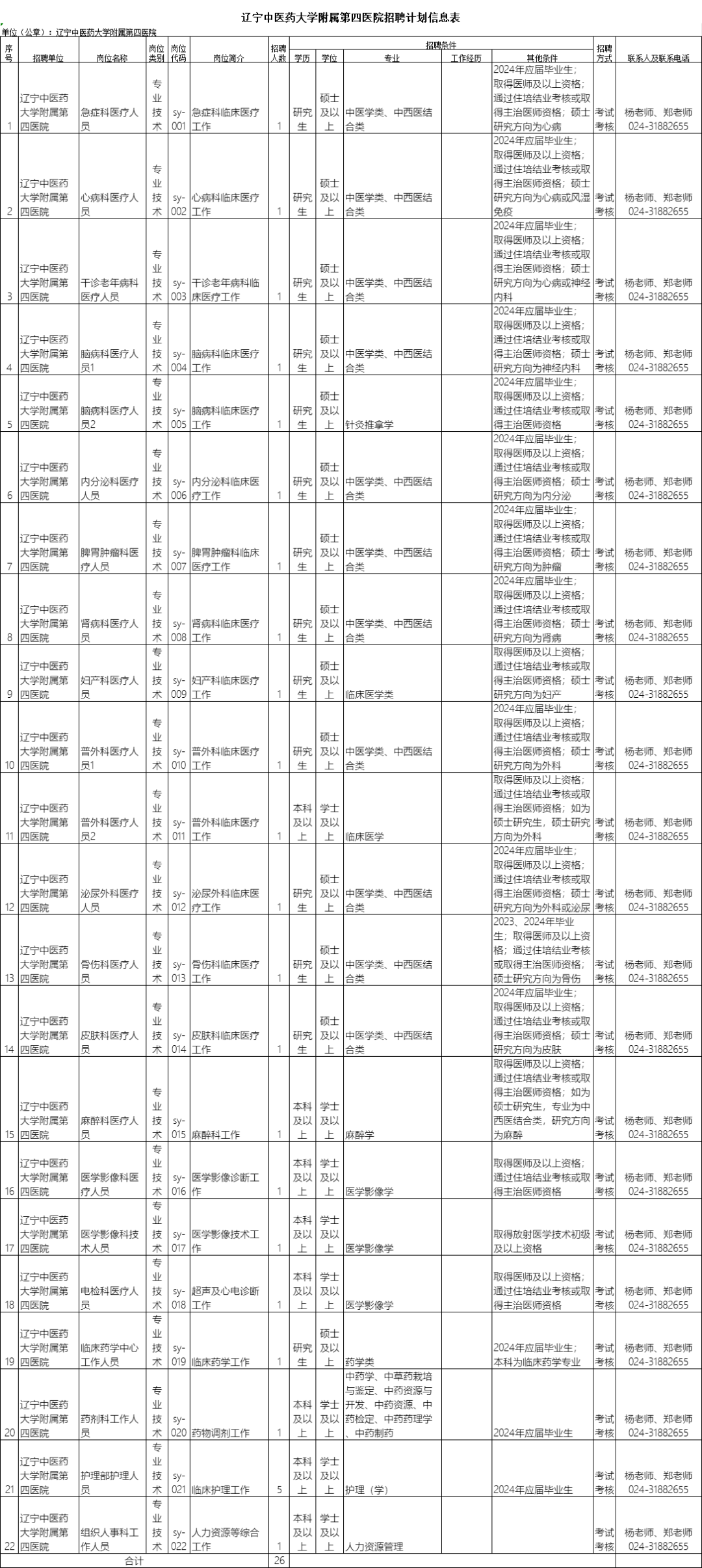 根据有关文件精神,结合我院实际,辽宁中医药大学附属第四医院面向社会自主招聘工作人员。