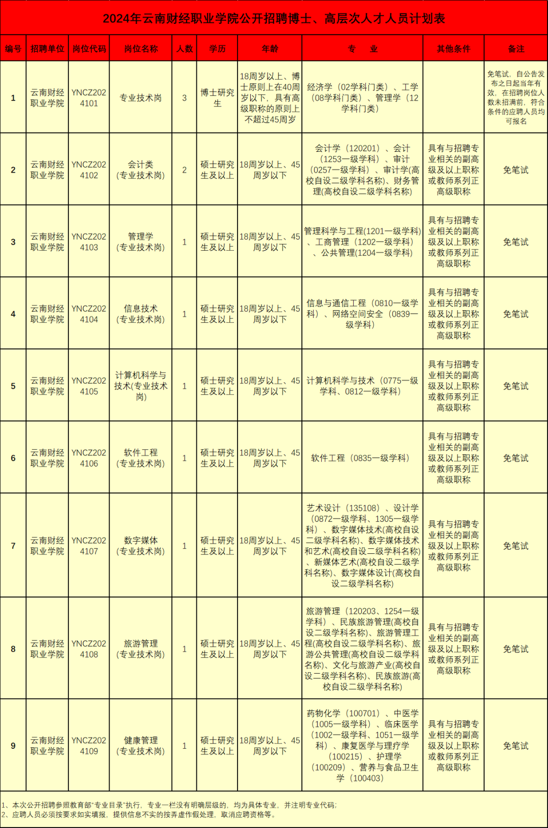 1.报考“YNCZ2024101”岗位免笔试,由云南财经职业学院适时组织面试。招聘博士岗位自公告发布之日起当年有效,在招聘岗位人数未招满前,符合条件的应聘人员均可报名。