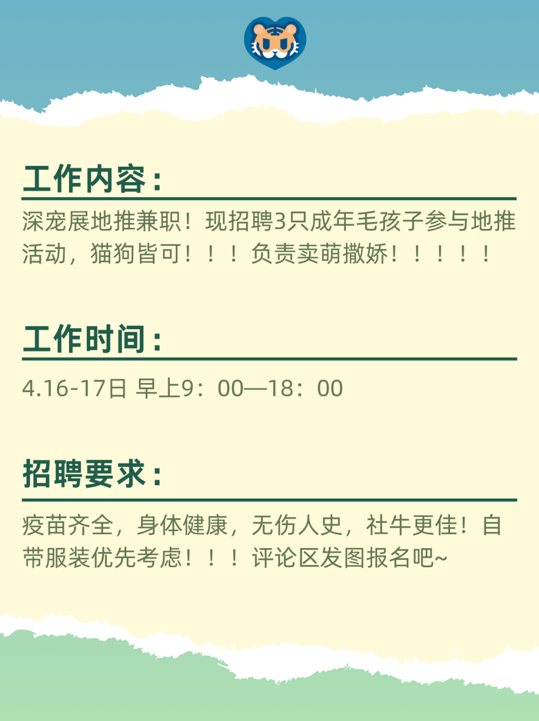 招聘要求:疫苗齐全,身体健康,e猫e犬最佳,不怕人不应激,无需主人随时陪同,没有伤人历史。自带服装优先考虑!!