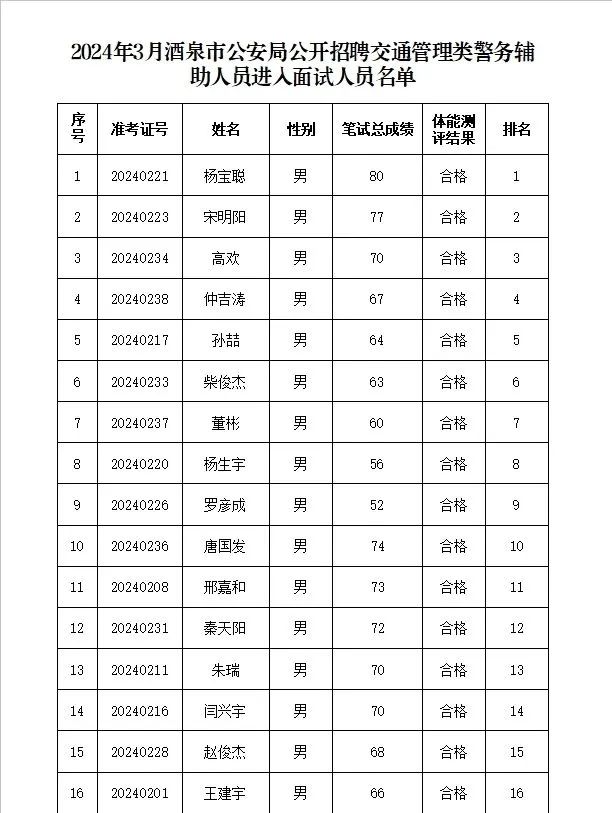 酒泉市公安局公开招聘交通管理类警务辅助人员面试工作定于2024年3月9日上午进行。