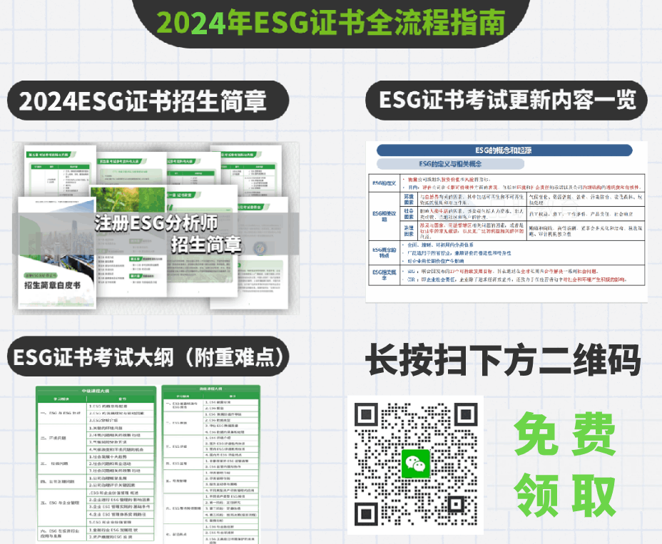 如果你对注册ESG分析师证书了解不够,品职为大家准备了《注册ESG分析师资料包》里面包含注册ESG分析师中级课程讲义、证书的报考条件、报考规则和流程、备考资料以及考试大纲等进群免费领取注册ESG分析师资料包