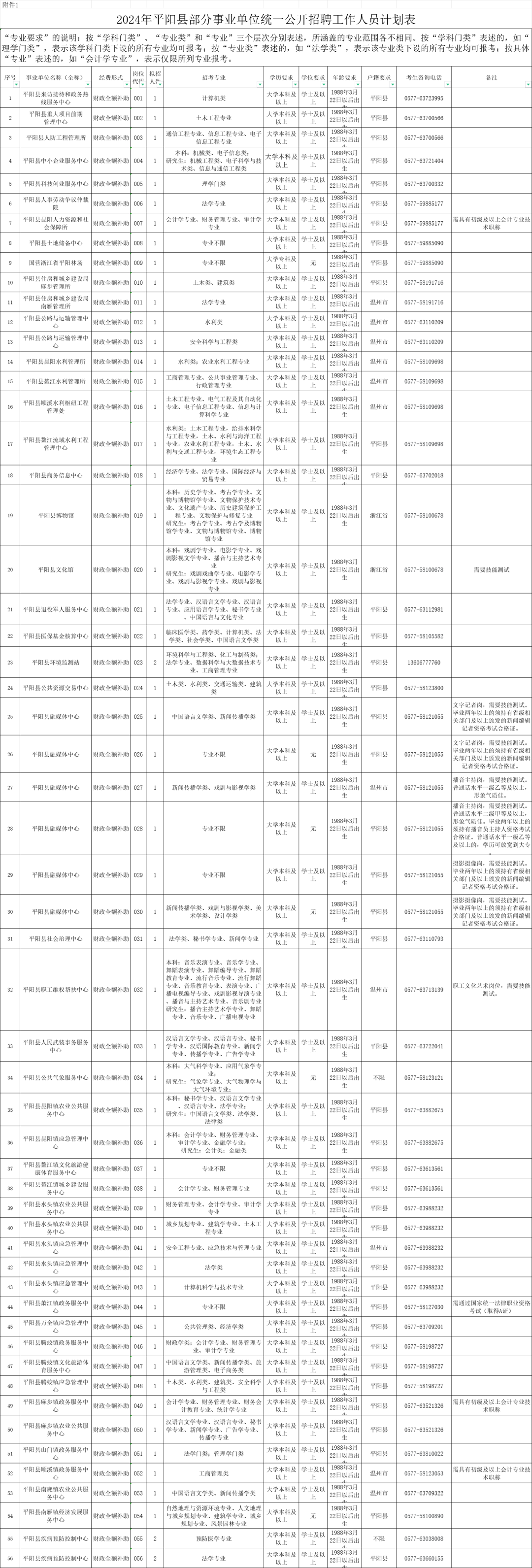根据《关于进一步加强事业单位公开招聘工作的指导意见》(浙人社发〔2012〕194号)、《温州市事业单位公开招聘工作人员暂行办法》(温政办〔2006〕220号)和《平阳县人民政府办公室关于印发平阳县事业单位公开考录选调工作人员办法的通知》(平政发〔2008〕162号)文件精神,经研究决定,我县部分事业单位面向社会公开招聘工作人员70名。现将有关事项公告如下: