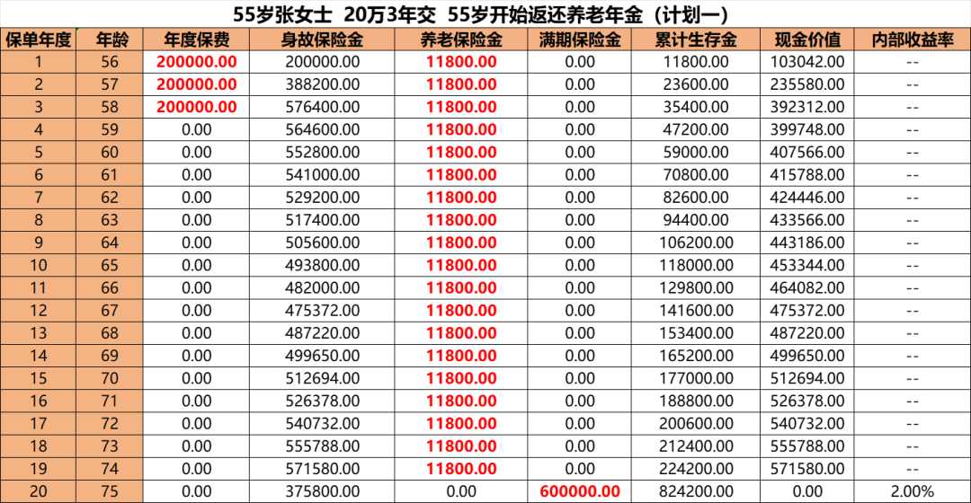 55岁开始投保当年即可每年返还11800元,返还至75周岁