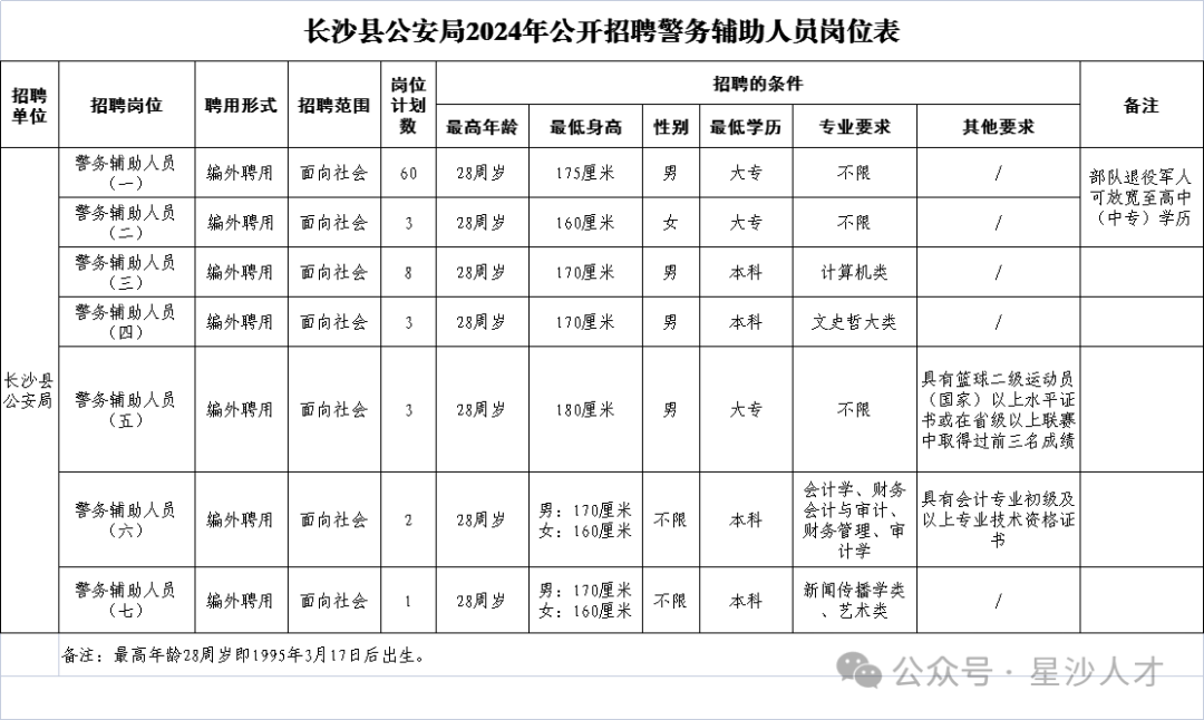 2.拥护中国共产党领导,拥护中华人民共和国宪法,遵守法律法规,品行端正。 3.年龄在18周岁以上,28周岁以下(1995年3月17日至2006年3月17日期间出生)。 4.具有符合招聘岗位要求的文化程度、工作能力和专业技能。2024年3月17日前未取得毕业证的人员不得报名参加考试。报考人员的学历必须为国家认可的学历,我省技工院校高级工班、预备技师(技师)班毕业生,可以分别按照大专、本科学历报考符合岗位要求且不限专业的招聘岗位。对有疑义的国民教育学历,以省以上教育行政部门认定的结果为准;对有疑义的党校学历,以省委组织部协调相关业务主管部门认定的结果为准;对有疑义的技校学历,以省人力资源和社会保障厅认定的结果为准,由招聘单位根据相关职能部门认定意见予以确认。国外留学所取得的学历须经教育部认证后才可报名。国外留学所取得的学历经教育部认证后可视同为相同等级国内计划内统招全日制学历。 (3)参加非法组织、邪教组织或者从事其他危害国家安全活动的; (6)依照国家规定不适宜从事警务辅助工作的其他情形。 发布信息—网络报名与资格初审—缴费-笔试—资格复审—面试—体能测评—体检—考察和资格终审—确定拟聘用人员名单—公示—办理相关人事手续。 招聘公告通过长沙星沙人才网(http://www.csxsrcw.com/)面向社会公开发布。有关考试具体安排、各环节相关信息等均在长沙星沙人才网(http://www.csxsrcw.com/)公布,请考生自行查阅,不再另行通知。 1.网络报名时间:2024年3月18日上午9:00-3月20日下午16:30。