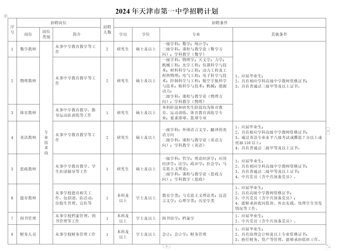 2024年拟招聘专业技术人员11名。具体岗位为数学、英语、物理教师各2人,体育、德育、思政教师各1人,图书管理1人,财务人员1人。详见《2024年天津市第一中学招聘计划》: