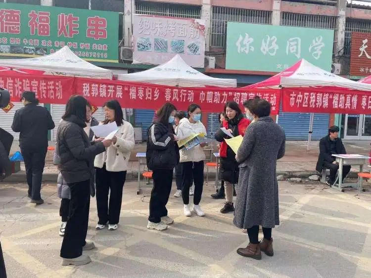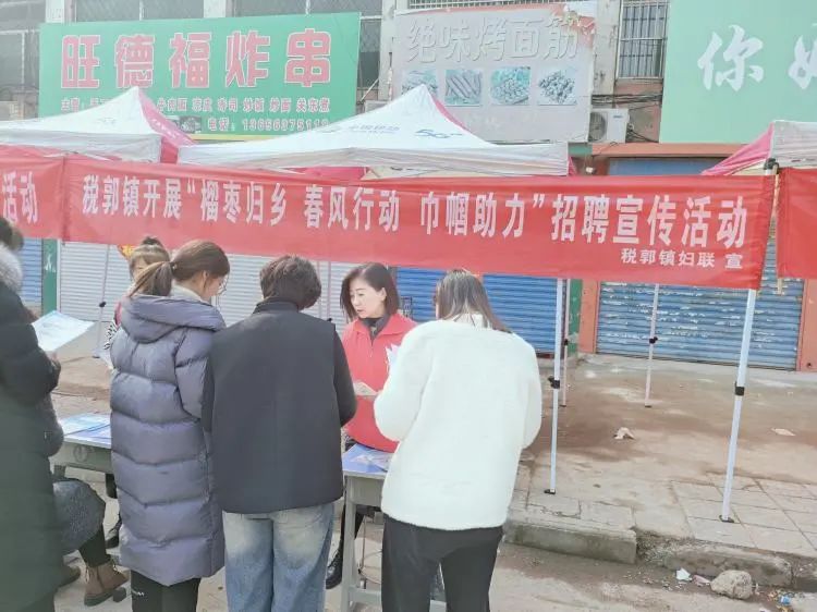 为全面贯彻落实稳就业工作要求,助力辖区企业用工及人才需求,为有需求的就业人员创造更多就业机会,实现"家门口"就业。税郭镇妇联、人社、综治等部门在税郭集市联合开展"榴枣归乡 春风行动 巾帼助力"招聘宣传活动。