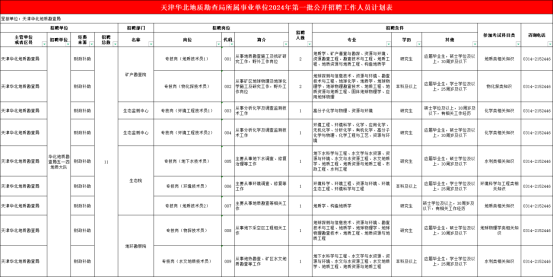 招聘单位、岗位名称、招聘条件、联系方式等信息详见《天津华北地质勘查局所属事业单位2024年第一批公开招聘计划表》(附件1)