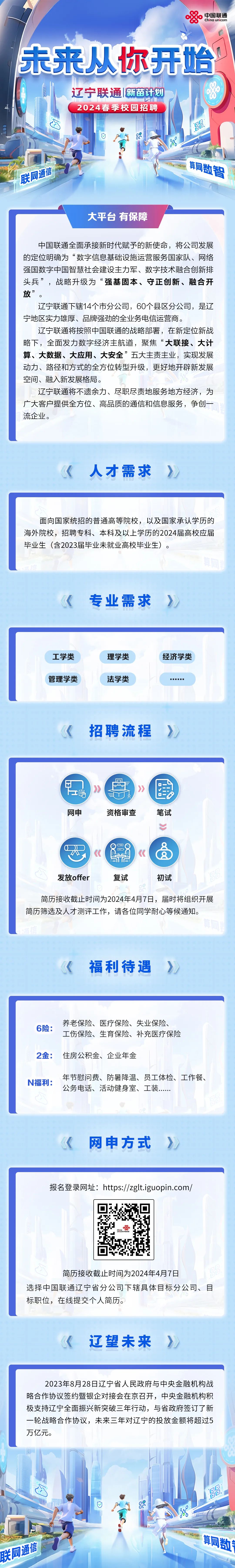 辽宁联通新苗计划2024春季校园招聘报名火热进行中,欢迎同学们踊跃报名。辽宁联通下辖14个市分公司,60个县区分公司,是辽宁地区实力雄厚、品牌强劲的全业务电信运营商。本次招聘100+余个岗位,欢迎大家踊跃报名!专业要求:工学类、理学类、管理学类、经济学类、法学类等六险二金N福利,辽宁各地均有岗位,请大家点击网站或扫描长图二维码进行了解报名~报名网址:https://zglt.iguopin.com/job(请使用PC端登录网址填报简历)