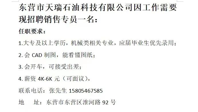 销售主管一名;负责东营及周边客户开发和维护,负责带领团队完成销售任务