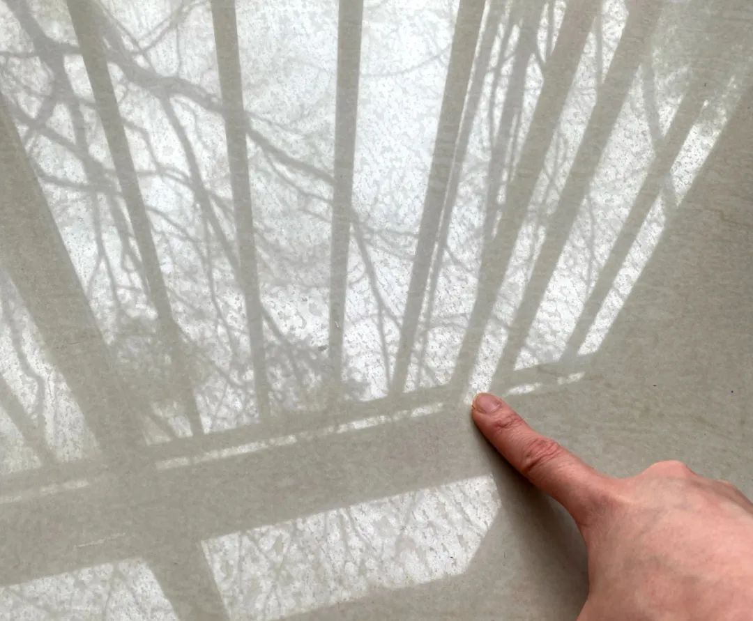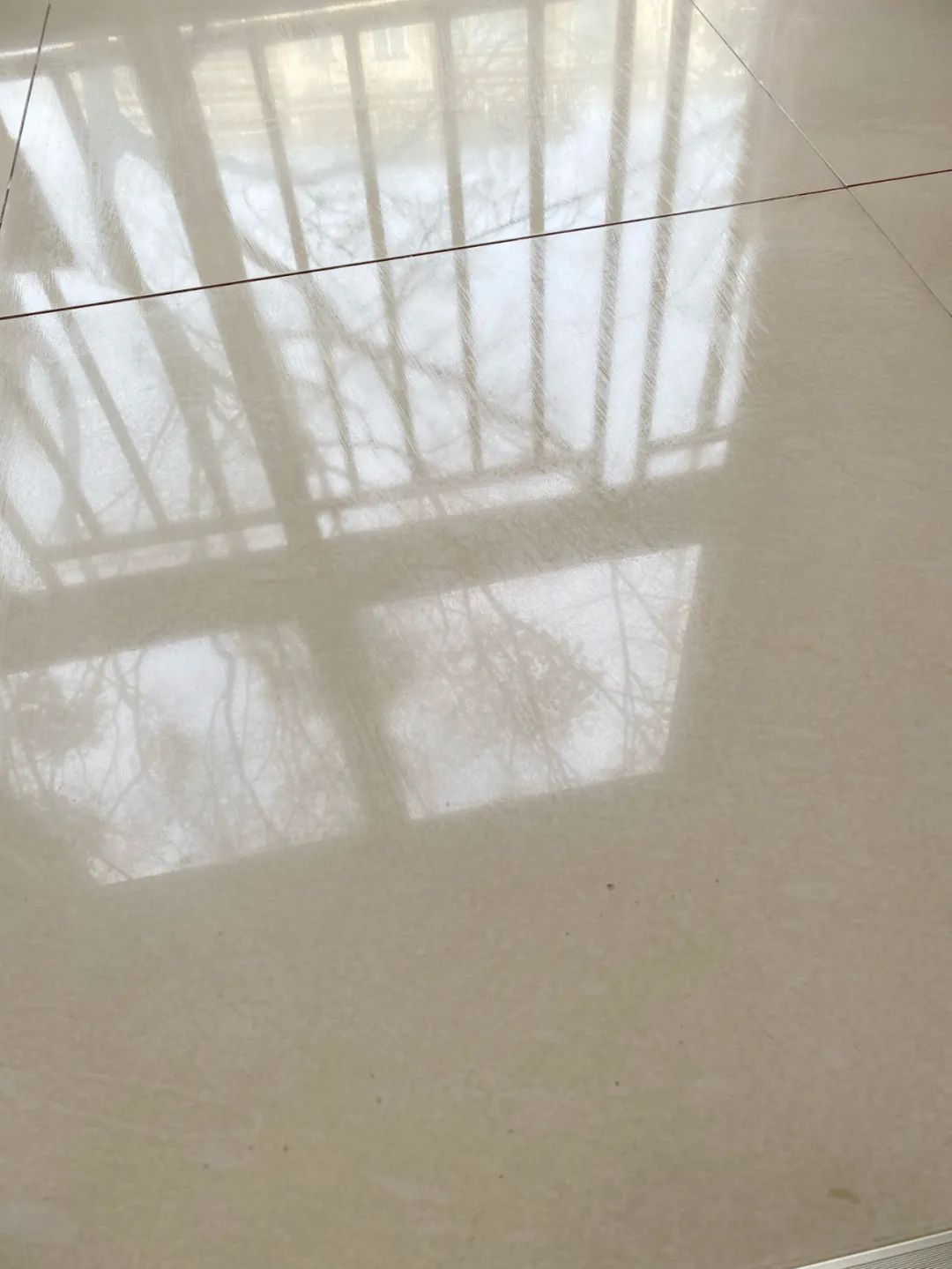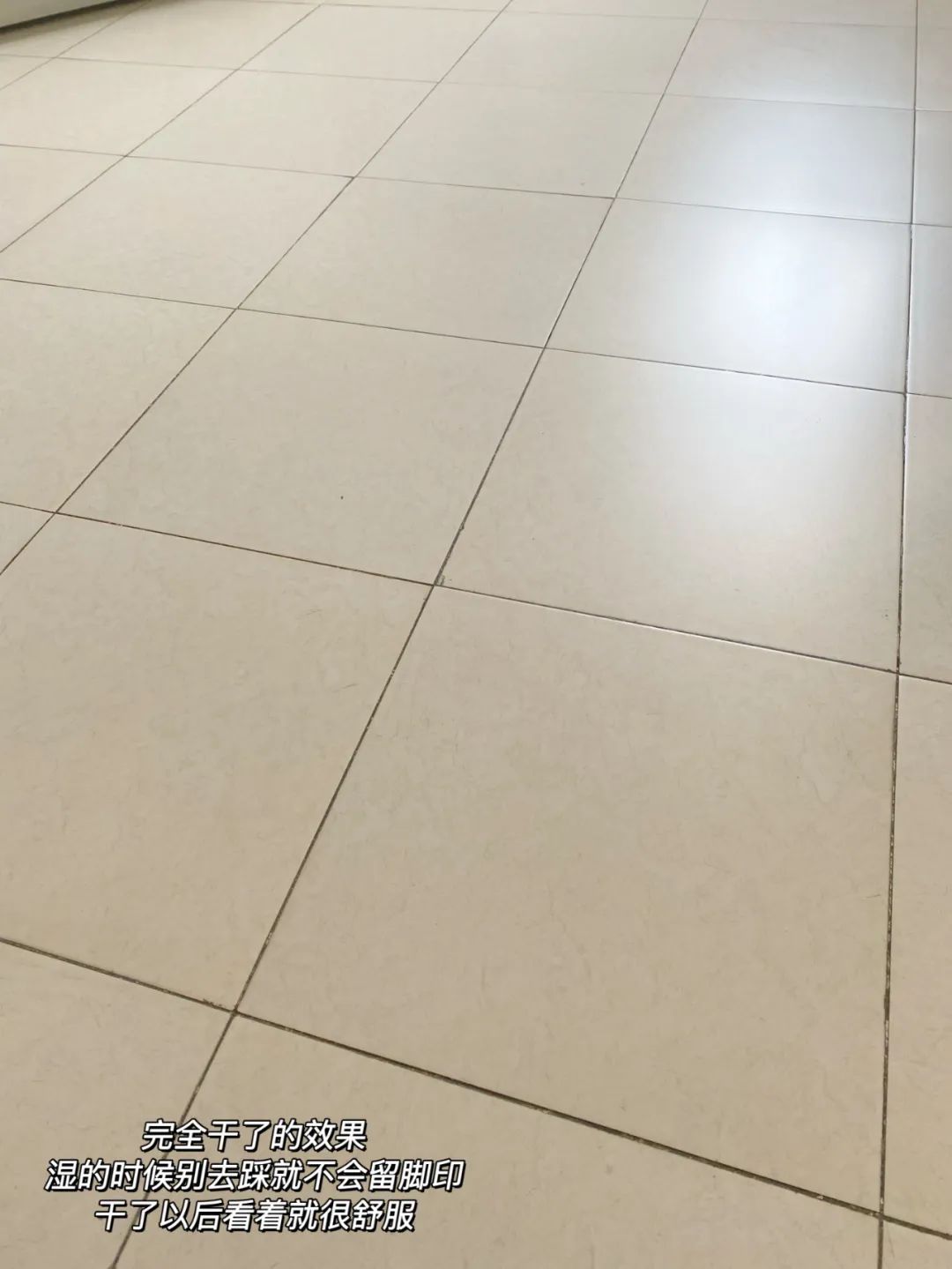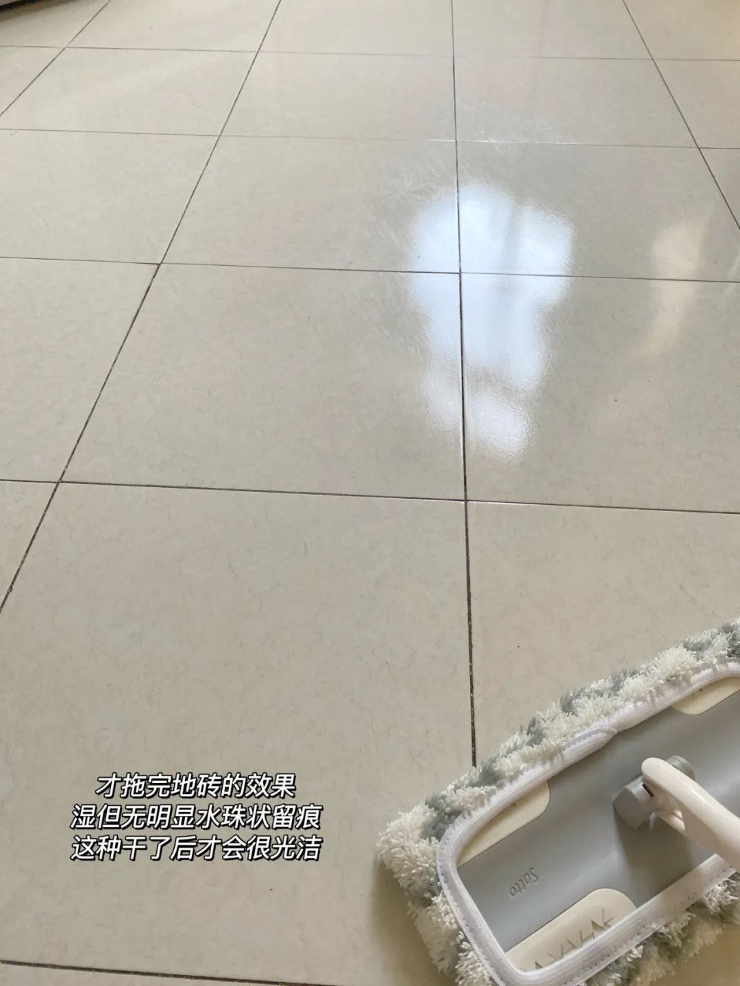 地砖对着光看,有很明显的、水珠状的痕迹。像这样干了以后就极易留痕,这就是拖布的问题。