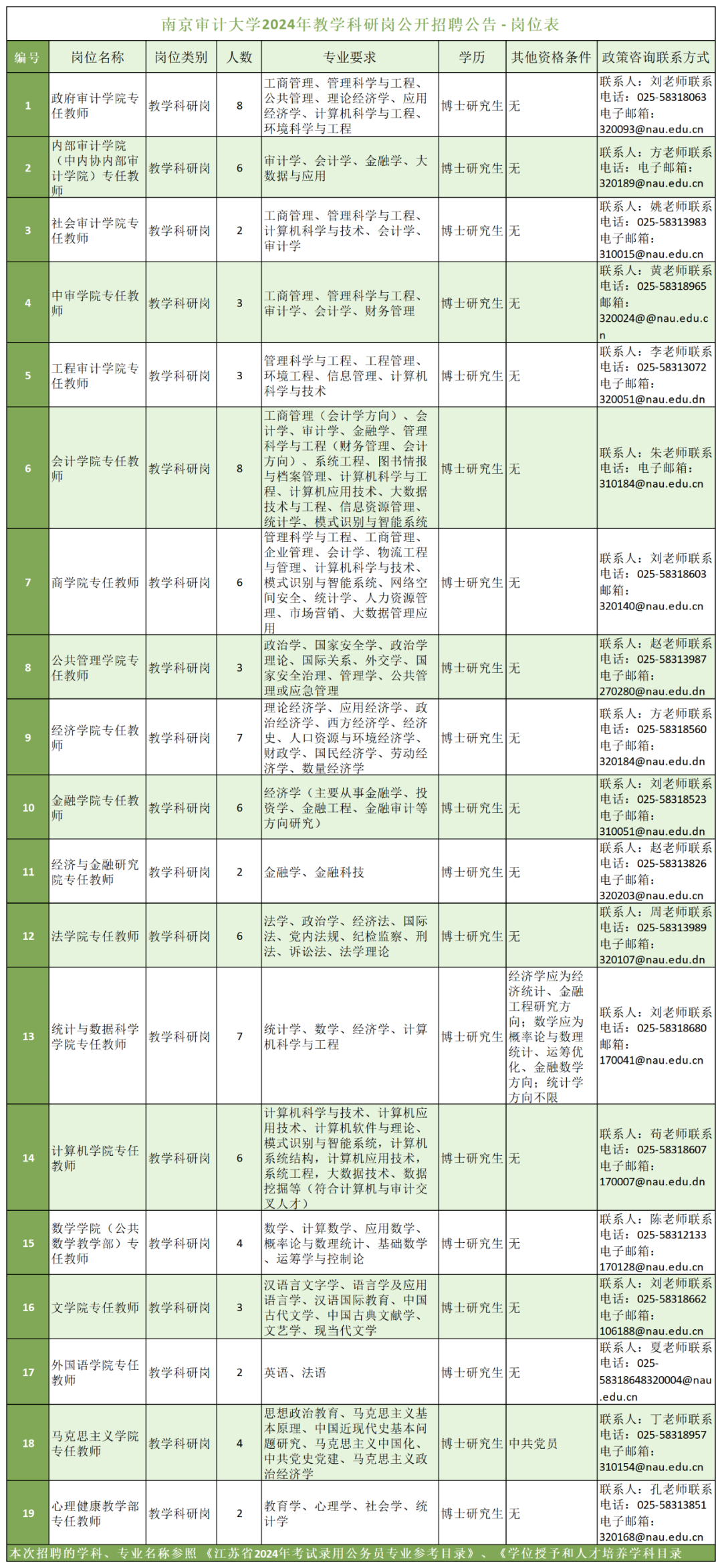 南京审计大学人事处及相关岗位联系人负责回答此次招聘政策咨询。