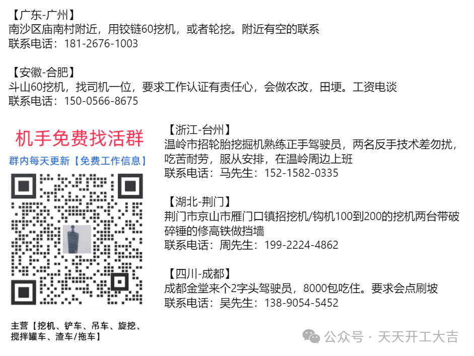 本日共更新挖掘机司机招聘信息10条,部分地区急招,有需要快点联系,不然错过了!!有合适的活,第一时间通知你!👇👇👇