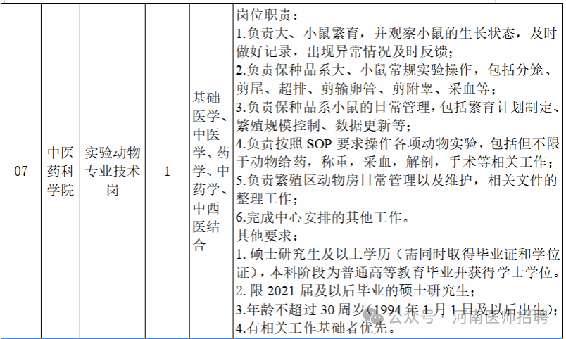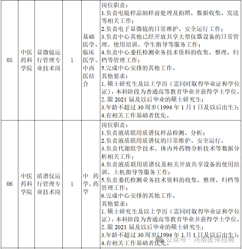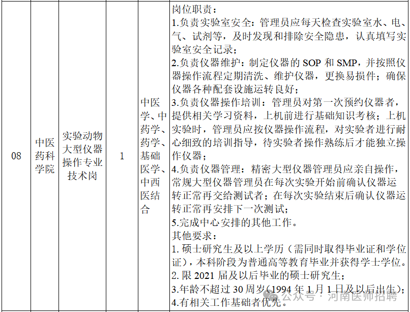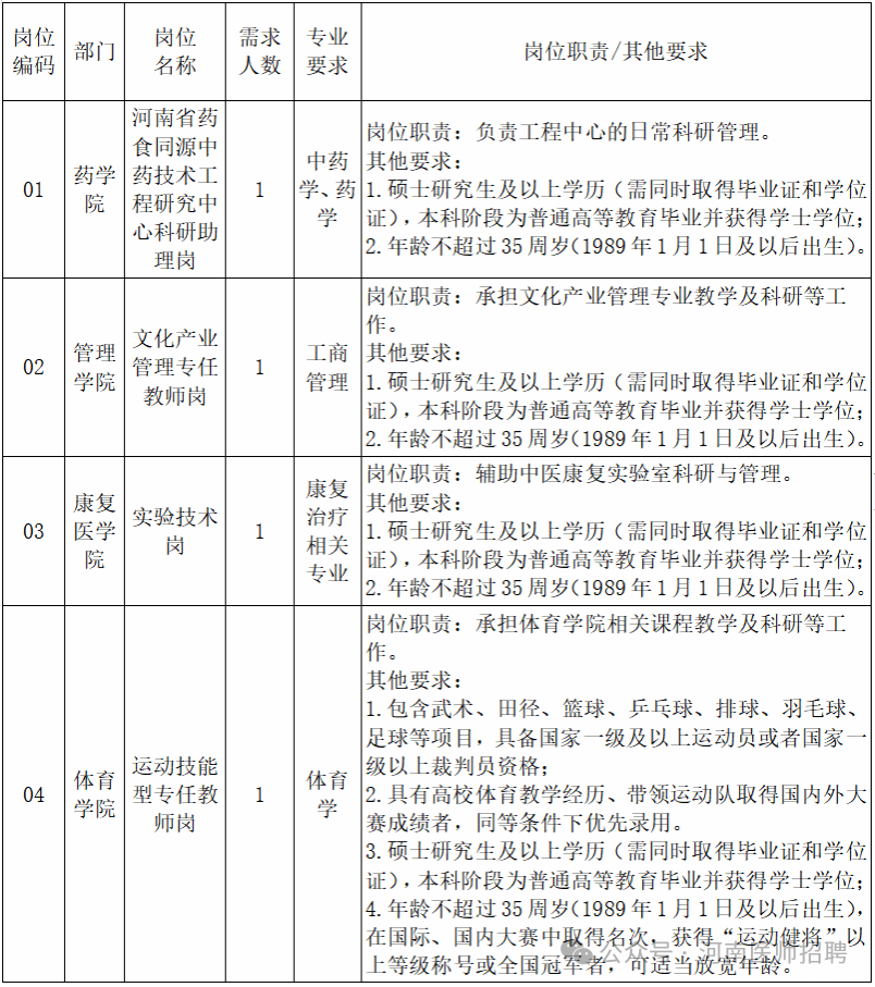 声明:本微信公众号刊载此文,无任何商业目的,目的是架起求职者和用人单位之间的桥梁,传递更多的招聘就业信息。若来源标注错误或侵犯了您的合法权益,请及时与我们联系,我们将及时更正、删除或依法处理,微信号(含:商务合作):sqdzry。河南中医药大学创建于1958年,是全国建校较早的高等中医药院校之一。学校位于省会郑州,现有5个校区,分别为龙子湖校区、东明路校区、人民路校区、东风路校区和文化路校区,是河南省人民政府和国家中医药管理局共建高校、国家中西部高等教育振兴计划高校、教育部中国政府奖学金生培养高校、教育部中医学专业“5+3”一体化招生院校、国家中医药国际合作基地、河南省特色骨干大学建设高校、河南省“双一流”创建高校、博士学位授权单位、荣获全国五一劳动奖状单位、河南省文明单位标兵,河南省中医药人才培养、科学研究、社会服务、文化传承与创新、国际交流与合作的龙头和中心。60多年来,学校已由单一的中医药学科发展为医、理、管、工、文等多学科协调发展,涵盖本科、研究生(博士、硕士)、留学生、继续教育等多个培养层次和类别的综合性中医药大学。现有普通全日制在校生25031人,其中硕士研究生3472人,博士研究生236人,留学生56人。根据工作需要,现面向社会公开招聘人事代理工作人员9名。