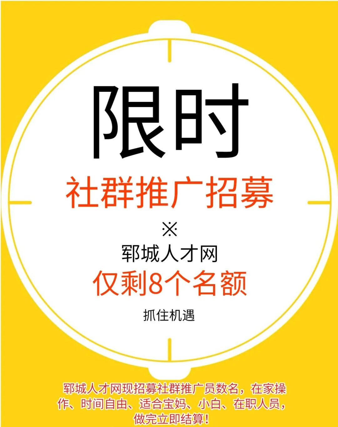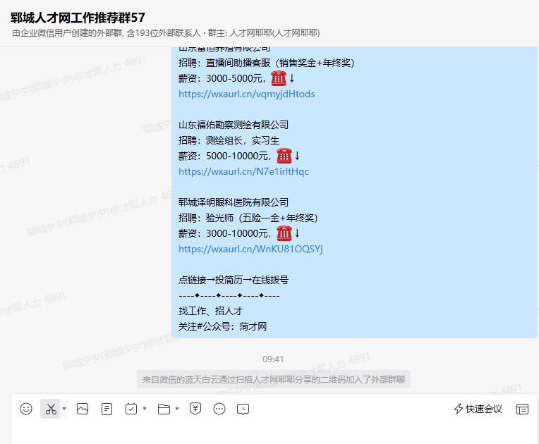 1、工作内容:让郓城本地人扫码进【郓城人才网工作推荐群】,进群没有任何风险也不会收费,主要就是为了给郓城本地的求职者推荐工作,按兼职邀请的实际人数结算费用。