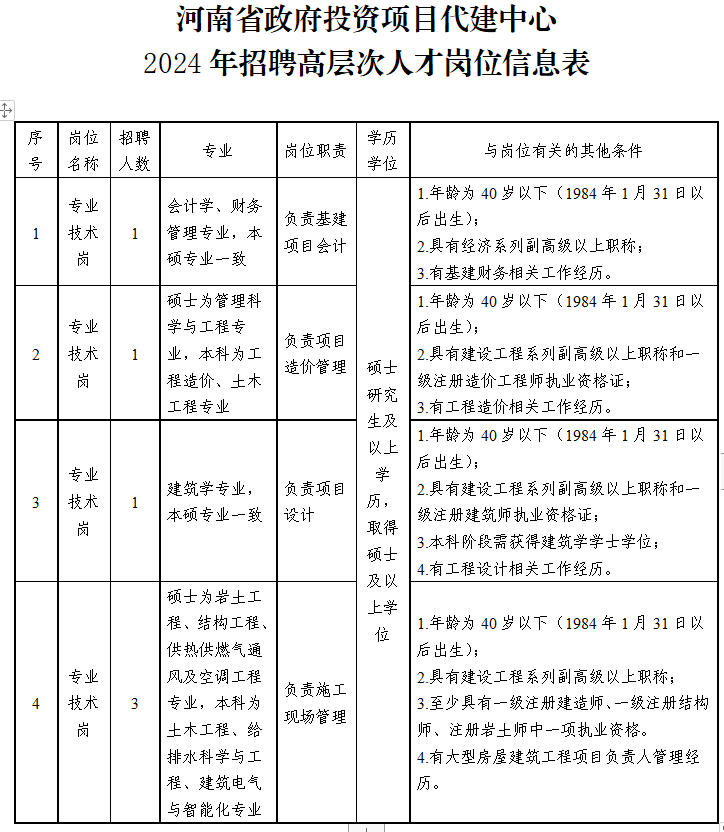 河南省代建中心为省住房城乡建设厅所属正处级公益一类事业单位,主要任务是:承担省政府投资非经营性项目的集中建设工作,代表出资人和使用单位履行项目建设的组织实施,负责对市县政府投资项目代建工作的技术指导。成立由厅主要负责人任组长,分管省代建中心的厅领导任副组长的招聘工作领导小组,领导小组办公室设在厅人事教育处,负责招聘工作的组织协调,省代建中心负责招聘工作的具体实施,并全程接受省人力资源社会保障厅的指导和监督。招聘要求