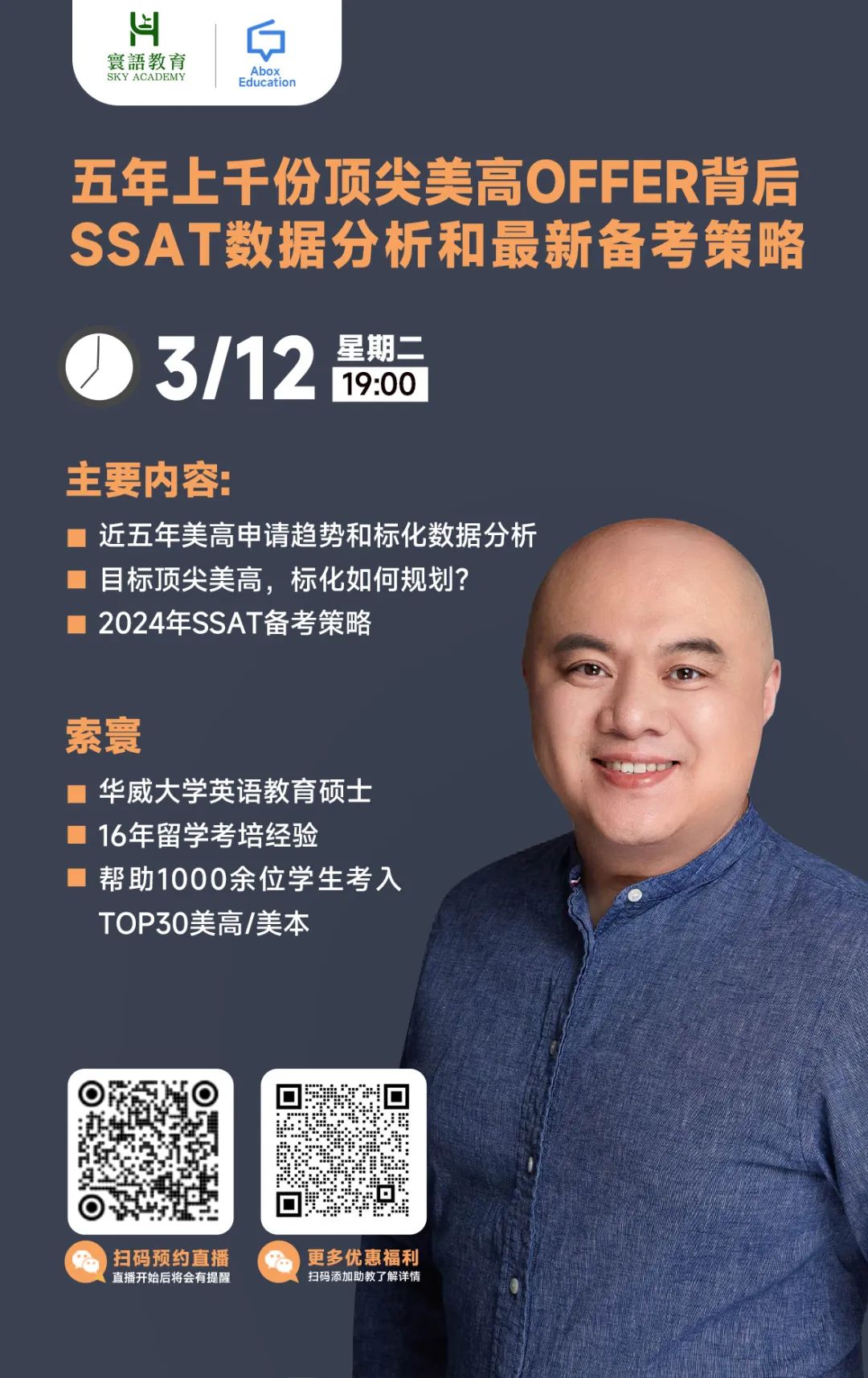 在追逐美国顶尖高中梦想的路上,标准化考试扮演着至关重要的角色。想要获得心仪的美高Offer,掌握SSAT备考的数据分析和最新策略势在必行。我们将在3月12日晚上7点举办一场直播,为大家揭秘近五年美高申请趋势、标化考试数据分析以及2024年SSAT备考策略。