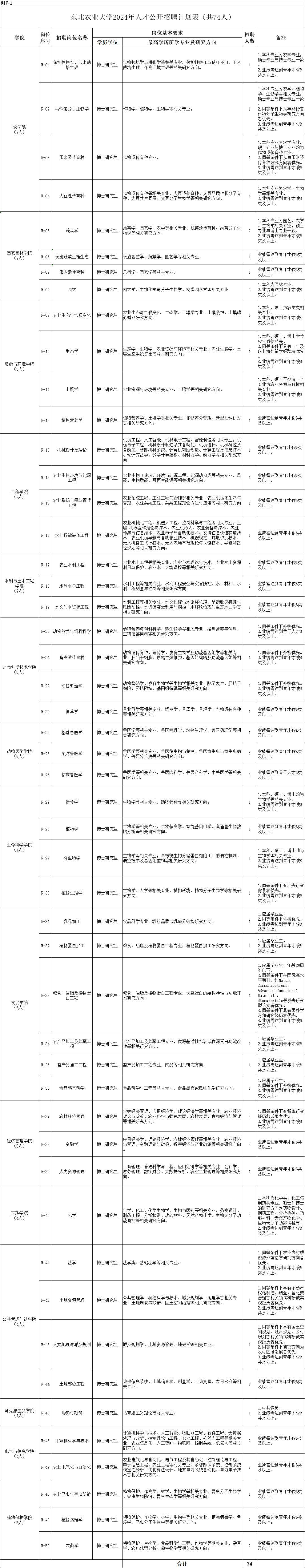详见《东北农业大学2024年人才公开招聘计划表》(第一批)(附件1)。