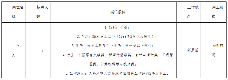 中国海峡人才市场系福建省政府所属事业单位,综合性人才服务机构,拥有国家级人力资源服务产业园,省人力资源服务行业协会会长单位。2014年龙岩市政府与中国海峡人才市场签署人才合作框架协议,经龙岩市委编办批准,设立中国海峡人才市场龙岩工作部,隶属中国海峡人才市场,为我市机关企事业单位招聘各类急需紧缺人才及开展人才公共服务、人才教育培训、两岸人才交流、海外人才引进等人力资源服务工作。因根据工作需要现拟招聘工作人员2名,具体公告如下: