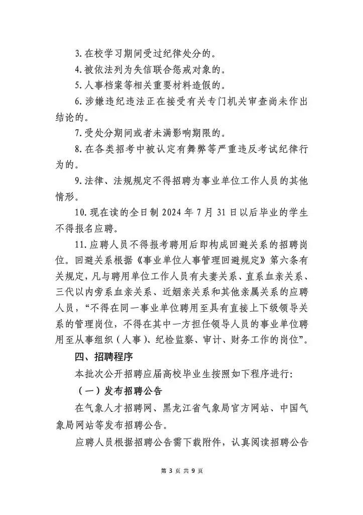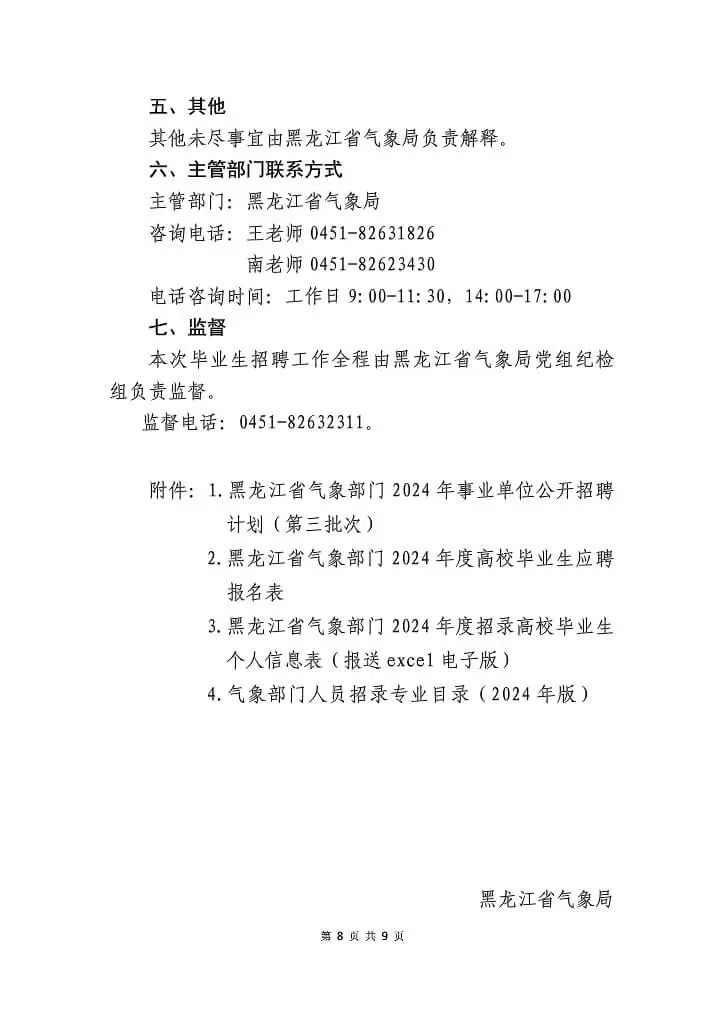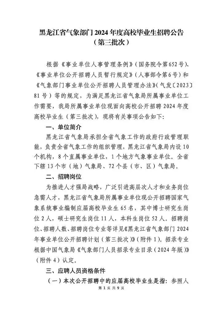 附件: 黑龙江省气象部门2024年度高校毕业生招聘公告(第三批次).pdf 附件1黑龙江省气象局2024年度事业单位公开招聘计划明细表(第三批次).et 附件3黑龙江省气象部门2024年度招录高校毕业生个人信息表(报送excel电子版).xlsx 附件4气象部门人员招录专业目录(2024年版).pdf 附件2黑龙江省气象部门2024年度高校毕业生应聘报名表.doc 原标题:黑龙江省气象部门2024年度高校毕业生招聘公告 (第三批次) 文章来源:http://hl.cma.gov.cn/zfxxgk/zwgk/rsxx/zpxx_90967/202403/t20240308_6113272.html 添加图文最下方小编微信获取完整公告链接、岗位表 ![]() ![]() ![]() ![]() ![]() ![]() ![]() ![]() ![]() ![]() ![]() ![]() ![]() 有问题可以找小编扫描下方二维码添加小编微信