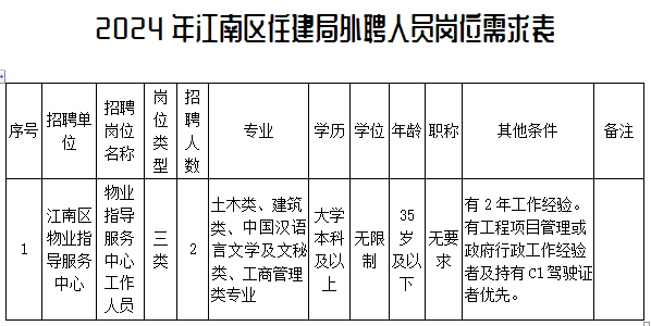 南宁市江南区物业指导服务中心编外工作人员(三类岗位)2名。招聘岗位条件详见《2024年江南区住建局外聘人员岗位需求表》(附件1)。