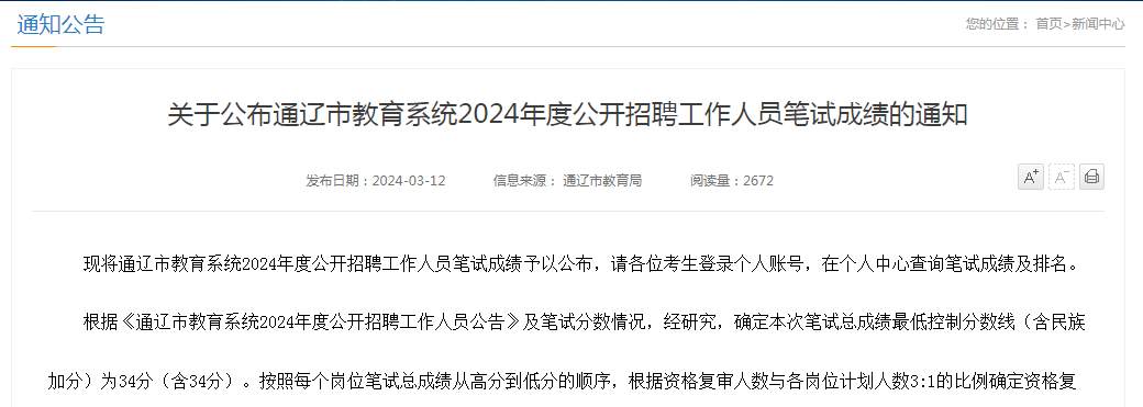 扫码回复【成绩】进入成绩查询入口 ![]() 现将通辽市教育系统2024年度公开招聘工作人员笔试成绩予以公布,请各位考生登录个人账号,在个人中心查询笔试成绩及排名。 根据《通辽市教育系统2024年度公开招聘工作人员公告》及笔试分数情况,经研究,确定本次笔试总成绩最低控制分数线(含民族加分)为34分(含34分)。按照每个岗位笔试总成绩从高分到低分的顺序,根据资格复审人数与各岗位计划人数3:1的比例确定资格复审人员。笔试总成绩低于34分的应聘人员不能进入资格复审环节。笔试阅卷工作接受纪检监察监督,在公证部门的公证下采用自动化评卷系统阅卷,除缺考、违纪、零分等特殊情况,不接受考生查分申请。 进入资格复审人员名单及相关要求另行通知,请及时关注通辽市教育局官方网站(http://jyj.tongliao.gov.cn/)及报名网站(https://zhaolu.tlsjyy.com.cn)。