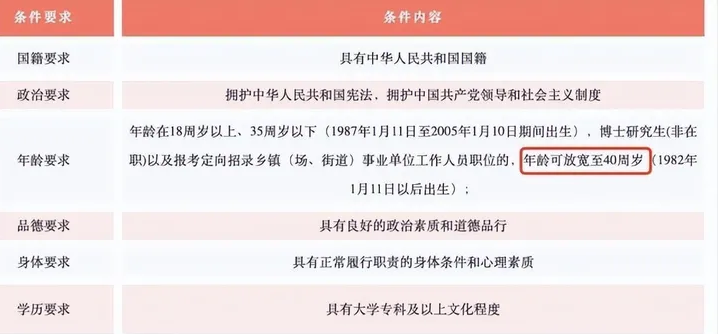 然而,这一政策明显已经开始趋紧。以江西为代表的省份,40岁的年龄限制仅适用于应届全日制博士。对于高学历人才的限制显然变得更为苛刻,因为过去甚至允许应届硕士生报考。这也凸显出当前学历贬值的现象十分严重。 尽管年龄放宽到40岁,但要求却相当高。全日制博士毕竟是相当稀缺的群体。据统计,中国每年只有六万名左右的本土博士毕业生,其中大多数都选择在高校、科研机构或企业工作。这使得这些高学历人才很难被吸引去考取公务员。 第二种情况:仅限特殊职业人群报考 这一种情况下,年龄上限的放宽主要限制在特殊的报考人群或特殊的岗位上。一般来说,这主要包括基层乡镇公务员和街道公务员岗位。只有特定人群,比如村两委干部以及社区干部,年龄才能放宽至40岁以下。